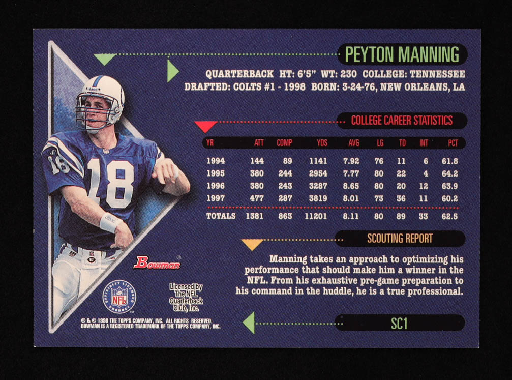 Peyton Manning 1998 Bowman Scout's Choice #SC1 RC