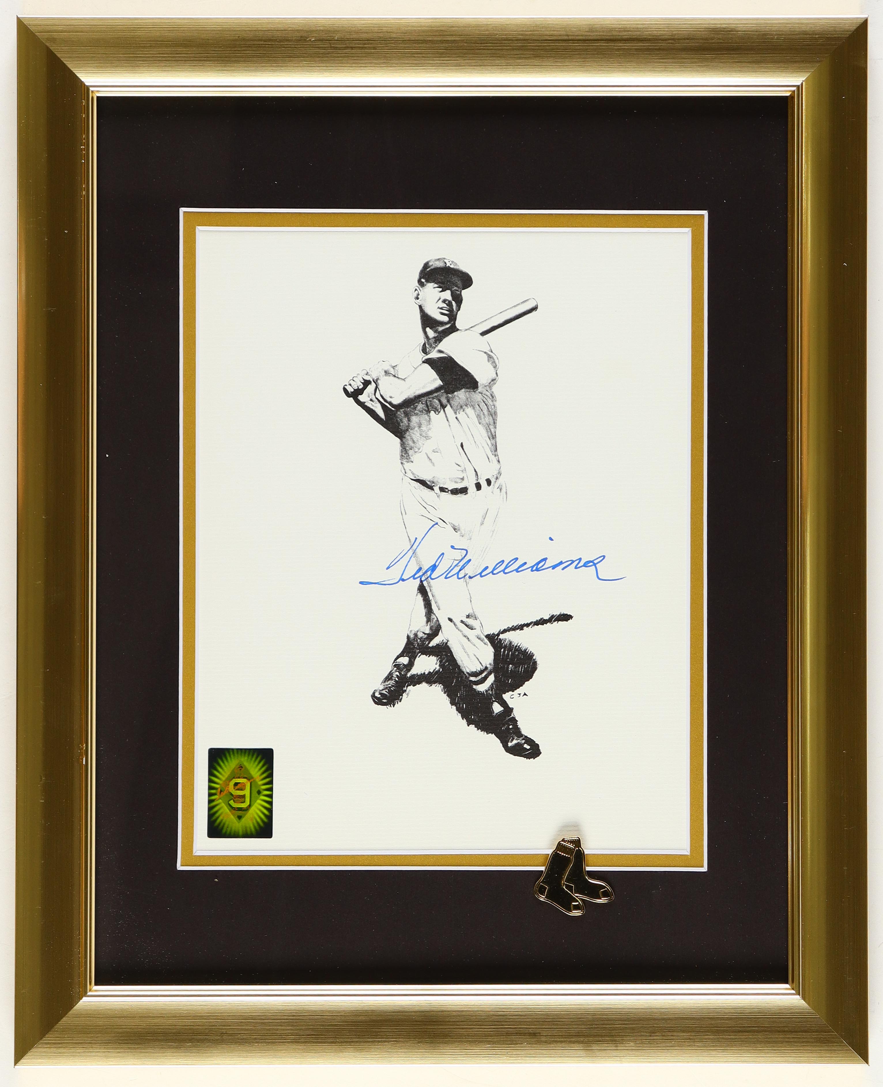 Custom frame measures approximately 13" x 16" in size and features a photo that has been hand-signed by Ted Williams (D. 2002, Boston Red Sox, HOF). The display also includes an official gold team logo pin. Please note, there is some scuffing on the frame.