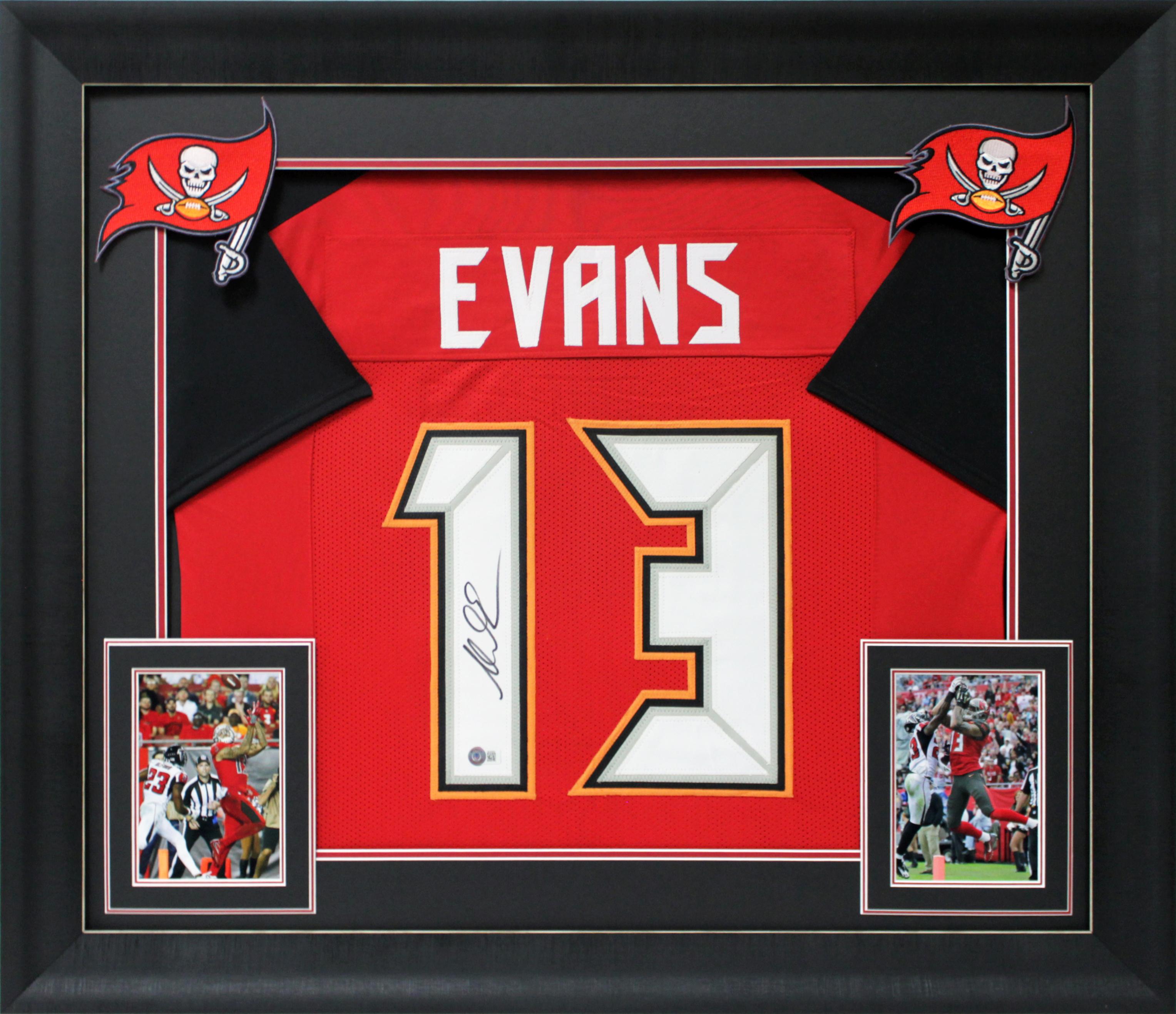 Custom frame measures 32" x 37" in size and features a jersey that has been hand-signed by Mike Evans.
