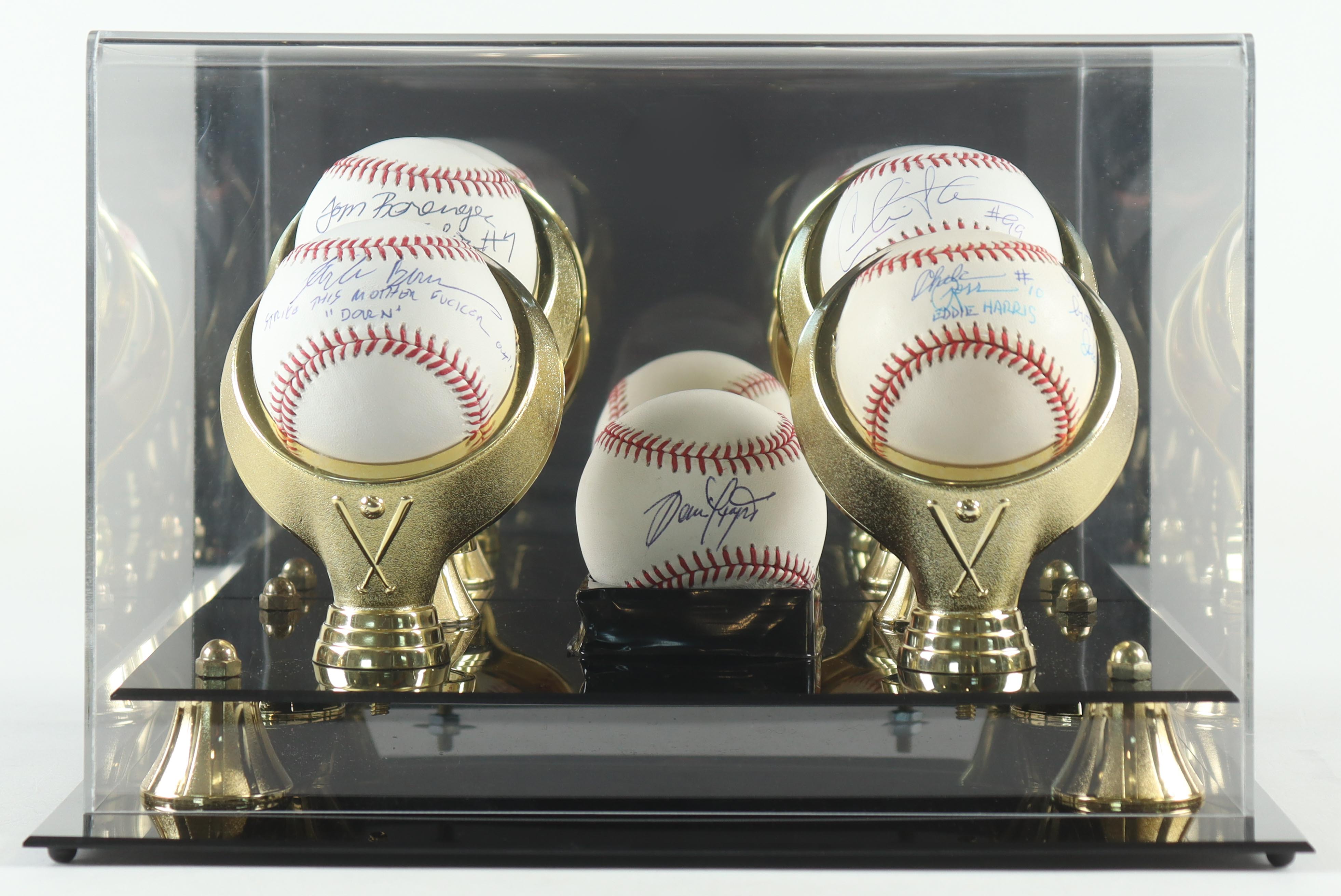 "Major League" display features (5) Rawlings Official baseballs. Each baseball is separately hand-signed and inscribed by Tom Berenger (Jake Taylor), Charlie Sheen (Ricky "Wild Thing" Vaughn), Corbin Bernsen (Roger Dorn), Chelcie Ross (Eddie Harris) & Dennis Haysbert (Pedro Cerrano). Display case is included as shown.