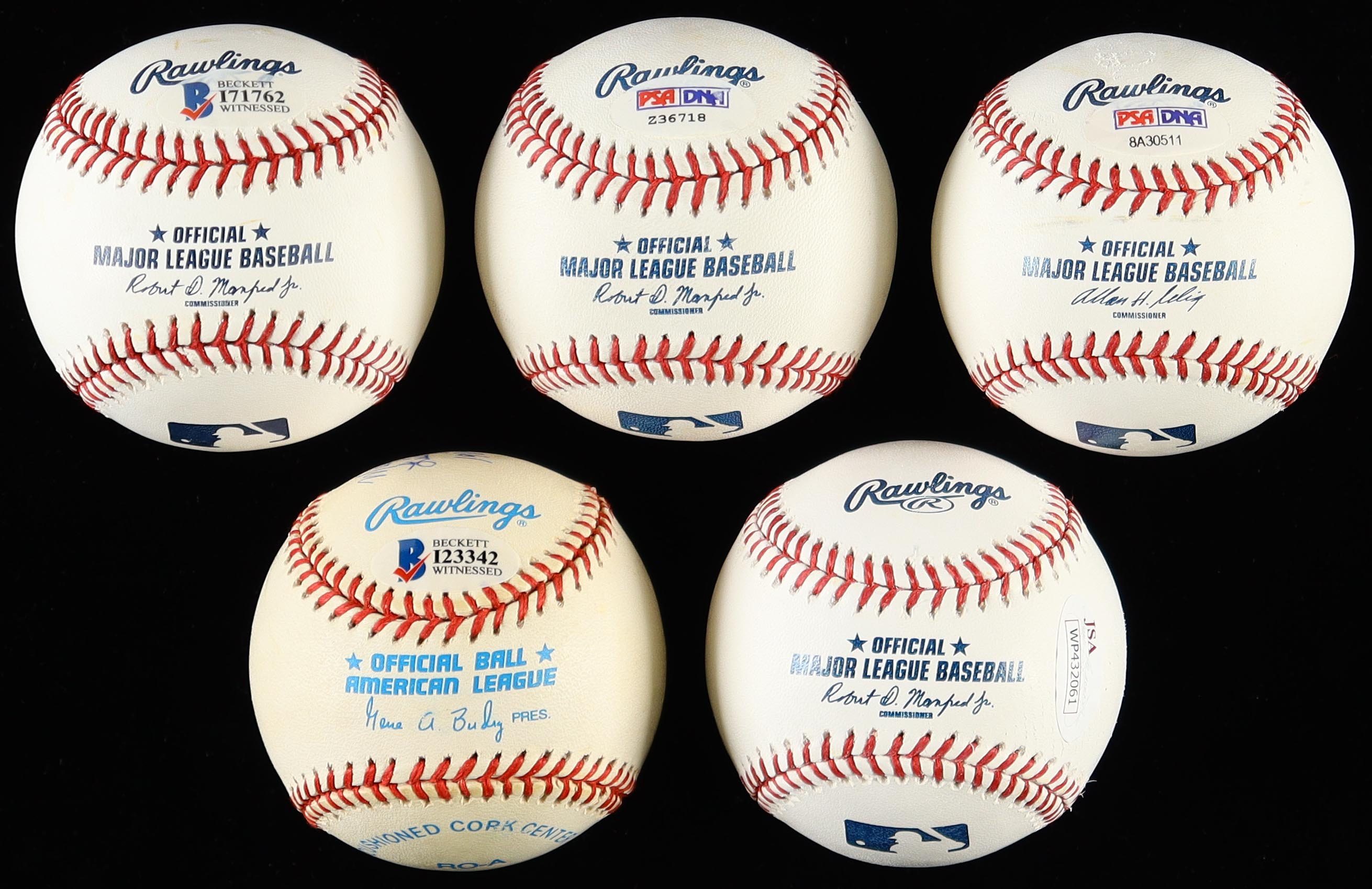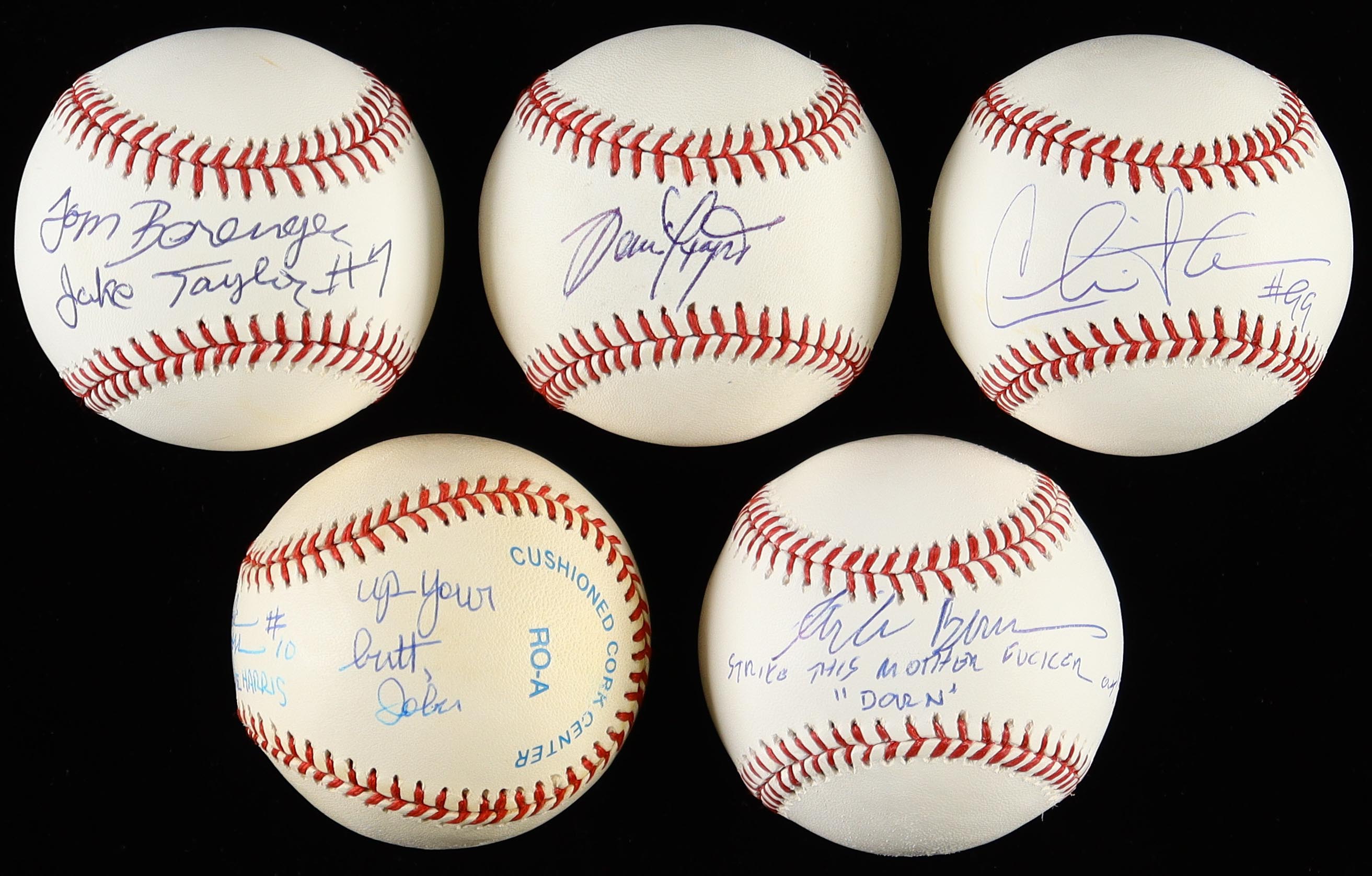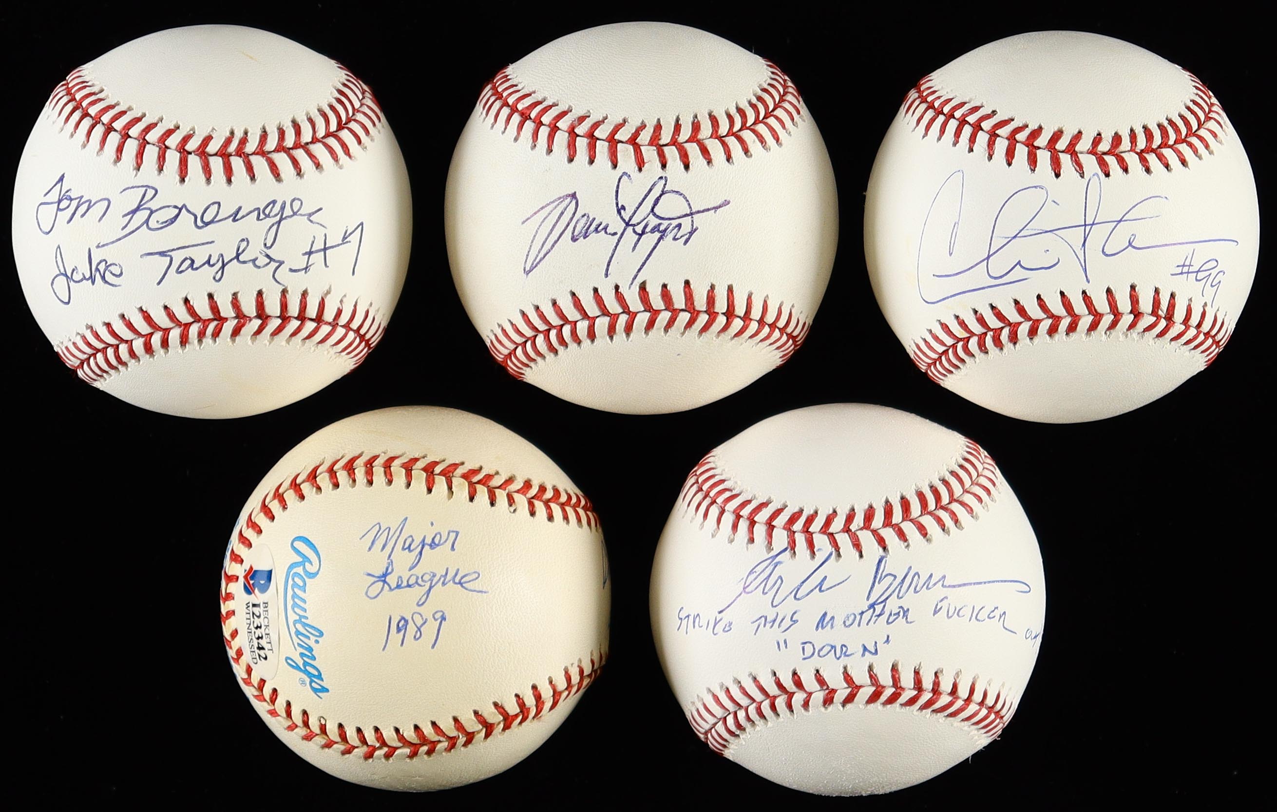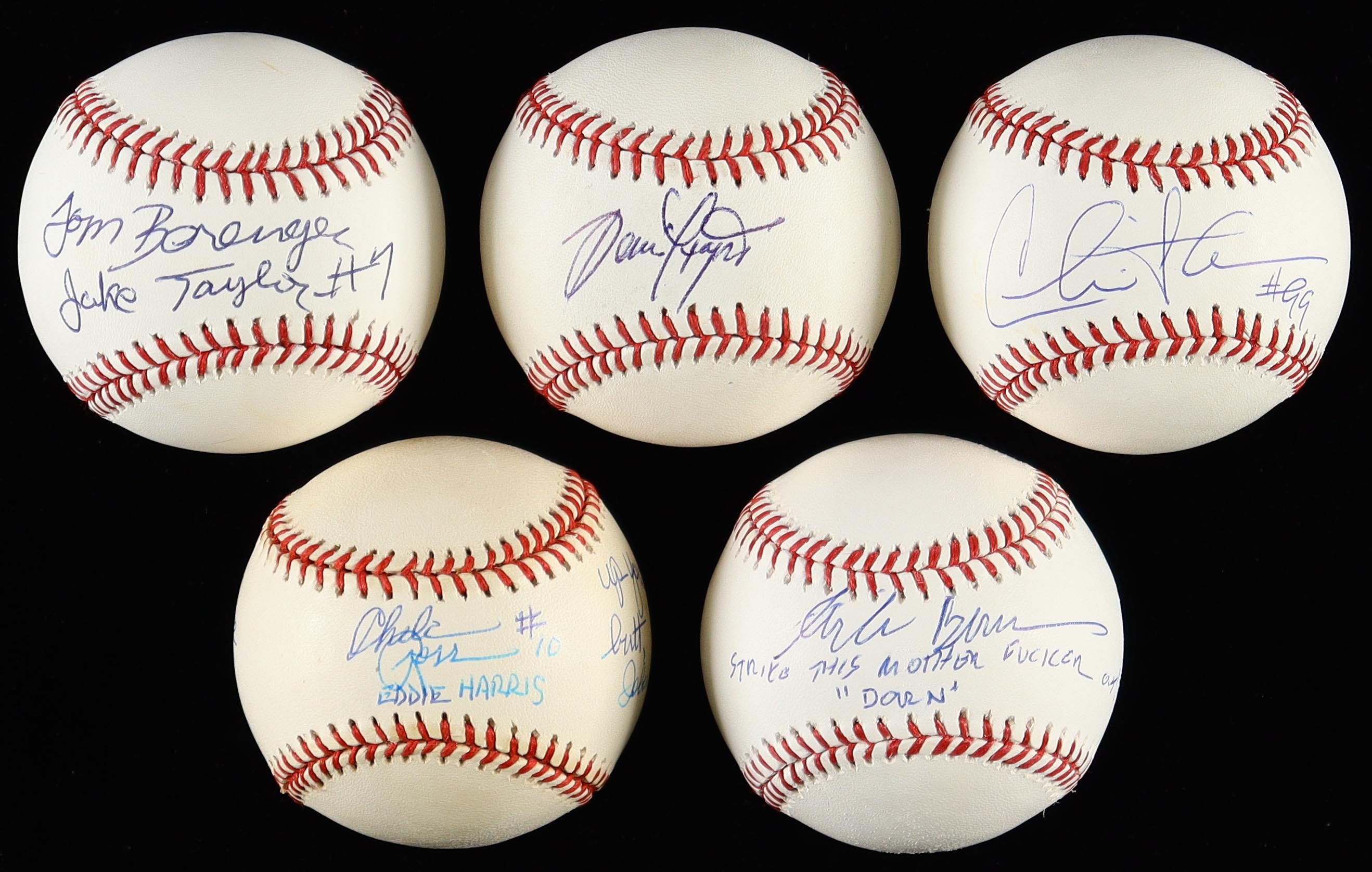 "Major League" Display Set of (5) Baseballs Cast-Signed By (5) With Tom Berenger, Charlie Sheen, Corbin Bernsen, Chelcie Ross, Dennis Dysbert "Cerrano" With Character Inscriptions (Beckett, PSA & JSA)
