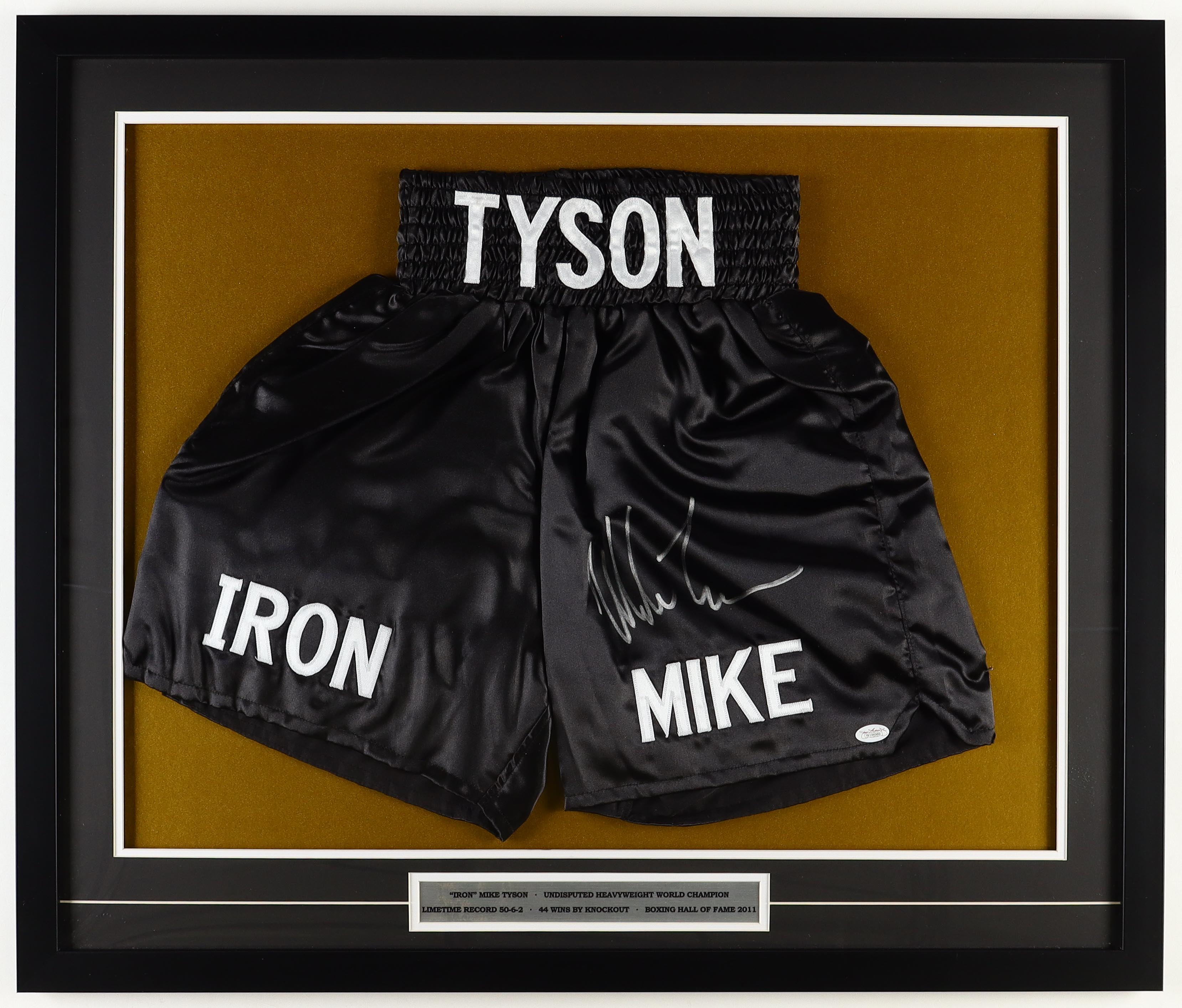 Mike Tyson Signed Custom Framed Boxing Trunks Display With Tyson Career Stats Plaque (JSA)