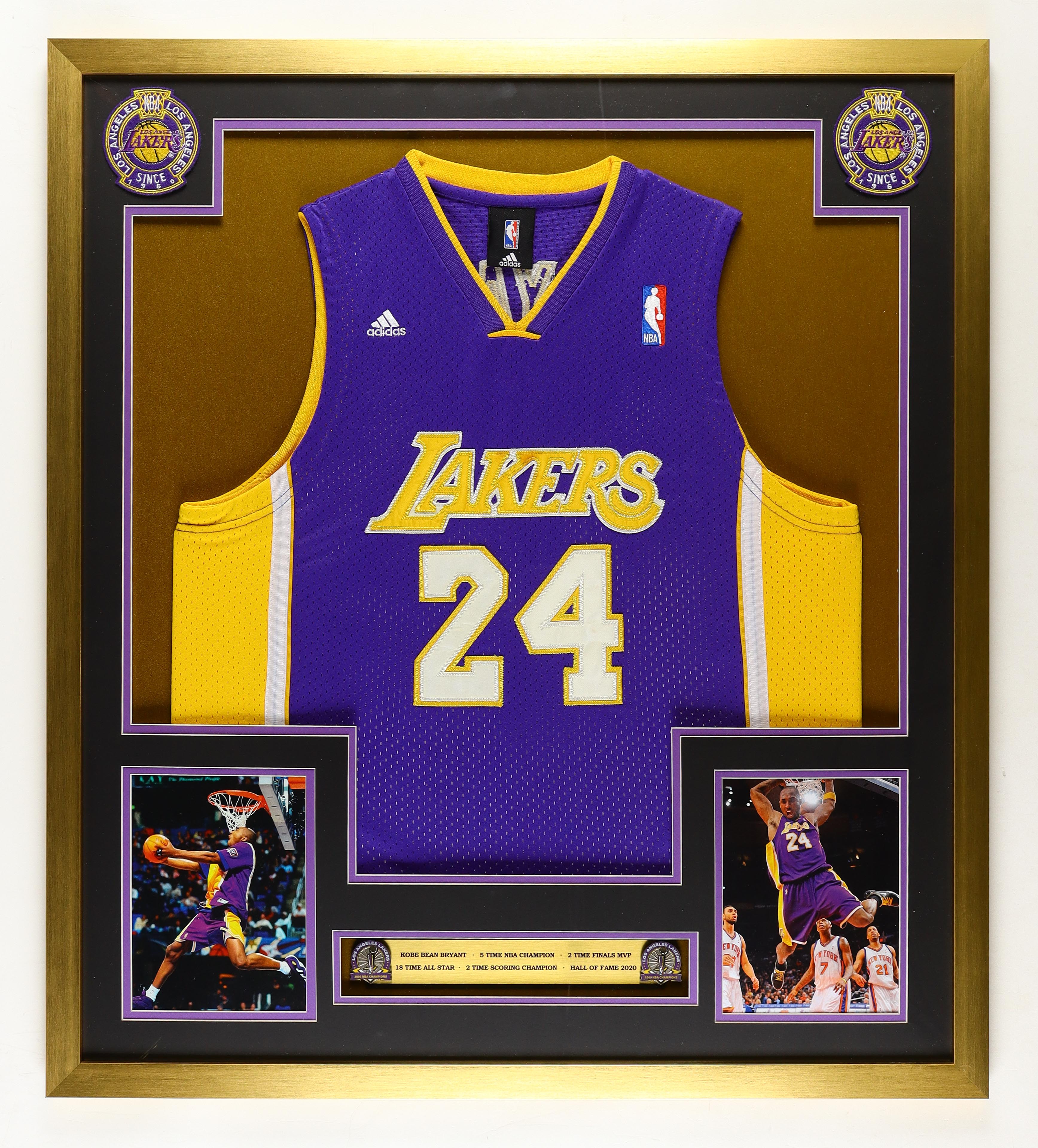Custom frame measures approximately 32" x 36" in size and features an unsigned Kobe Bryant (D. 2020, Los Angeles Lakers, HOF) NBA Adidas jersey as well as (2) LE Los Angeles Lakers Championship Pins & (2) Cloth Team Logo Patches. Please note, the display is unsigned.