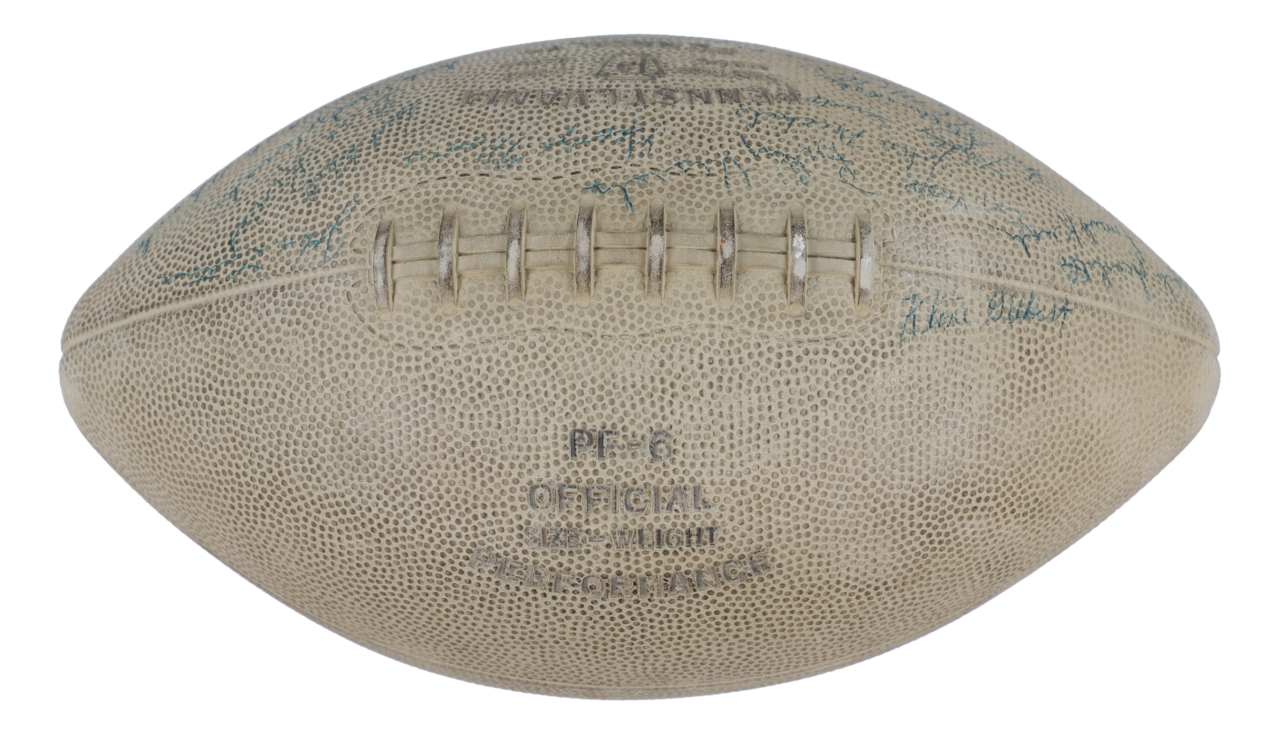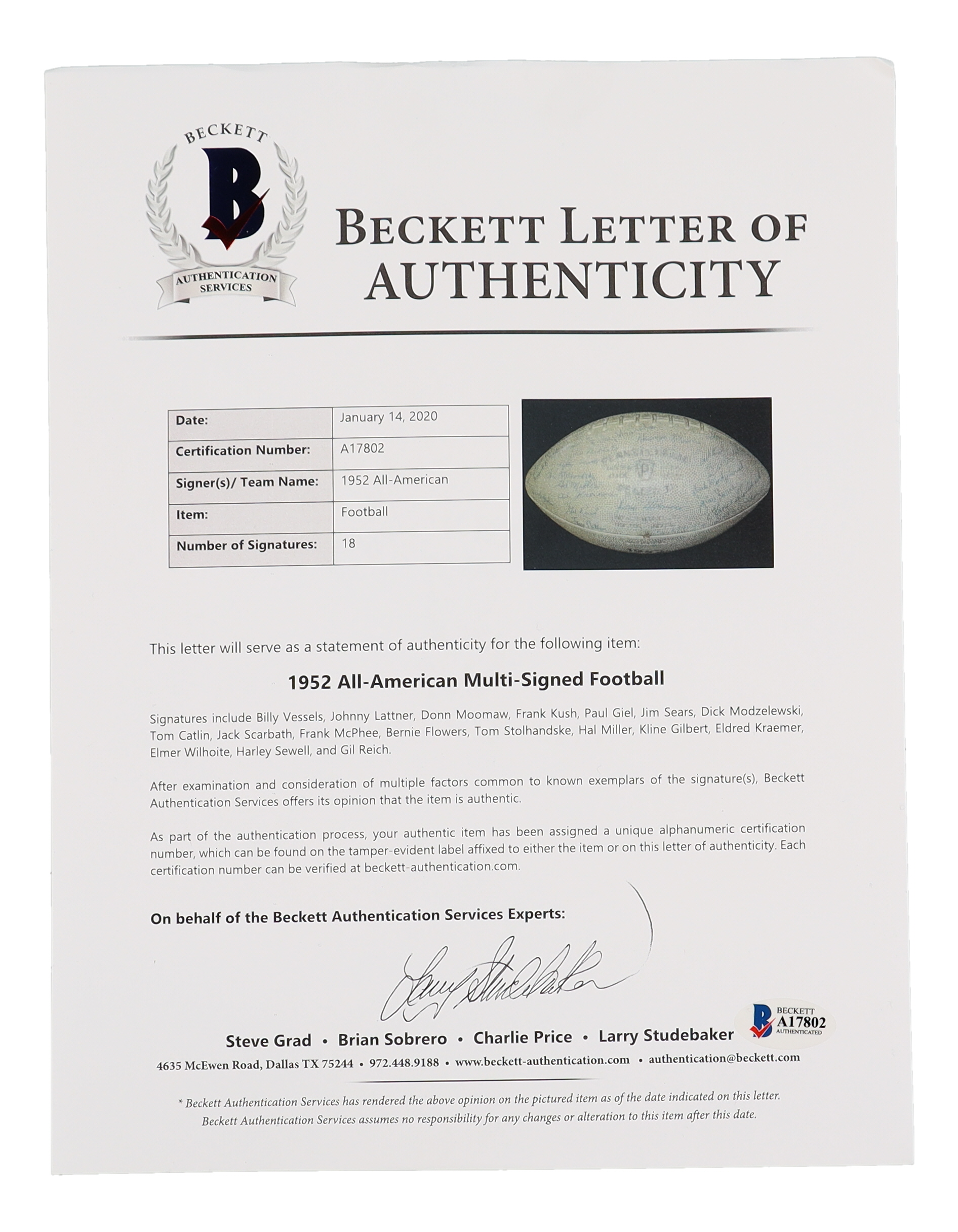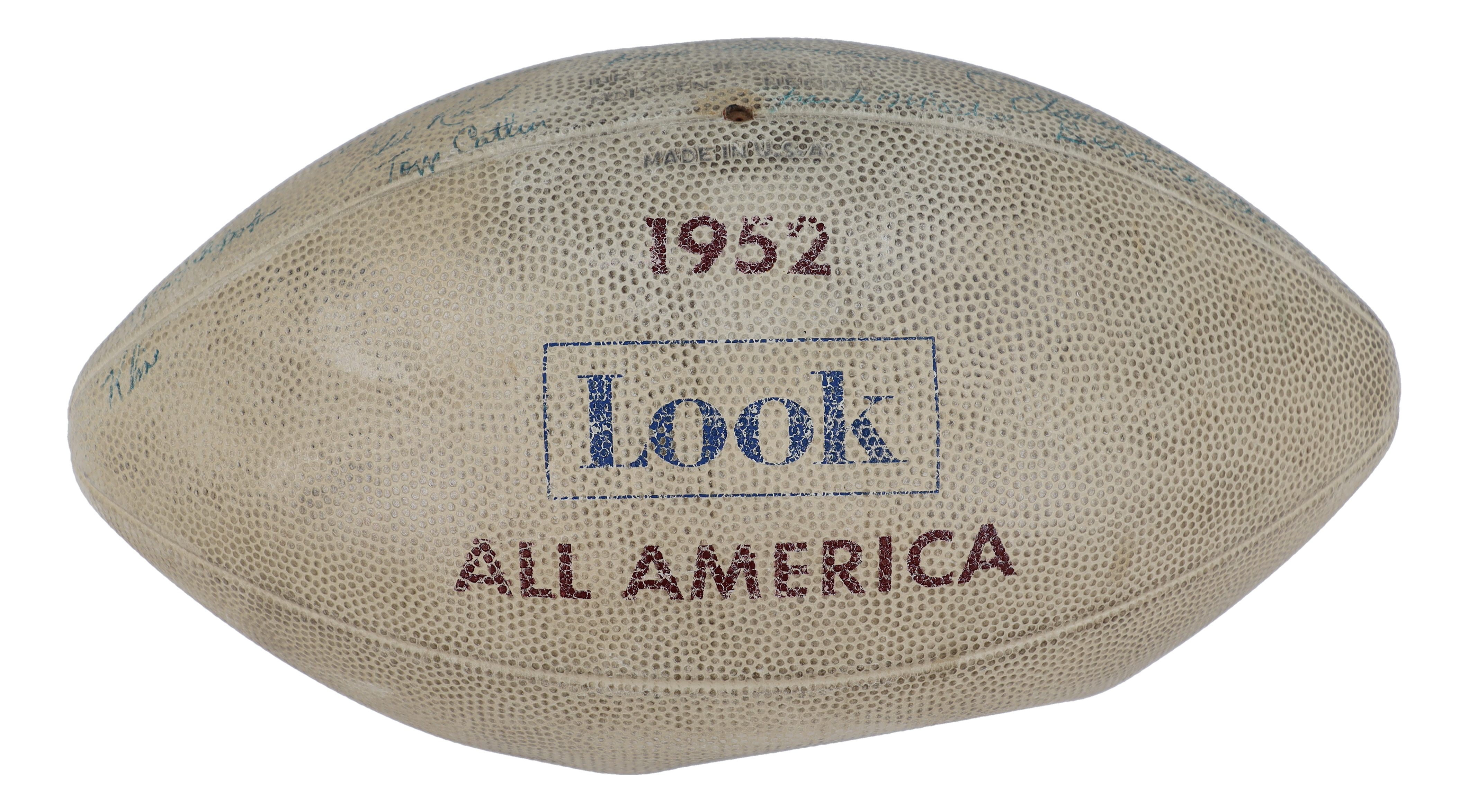 1952 All-American football has been hand-signed by Billy Vessels, Johnny Lattner, Donn Moomaw, Frank Kush, Paul Giel, Jim Sears, Dick Modzelewski, Tom Catlin, Jack Scarbath, Frank McPhee, Bernie FLowers, Tom Stolhandske, Hal Miller, Kine Gilbert, Eldred Kraemer, Elmer Wilhoite, Harley Sewell and Gil Reich.
