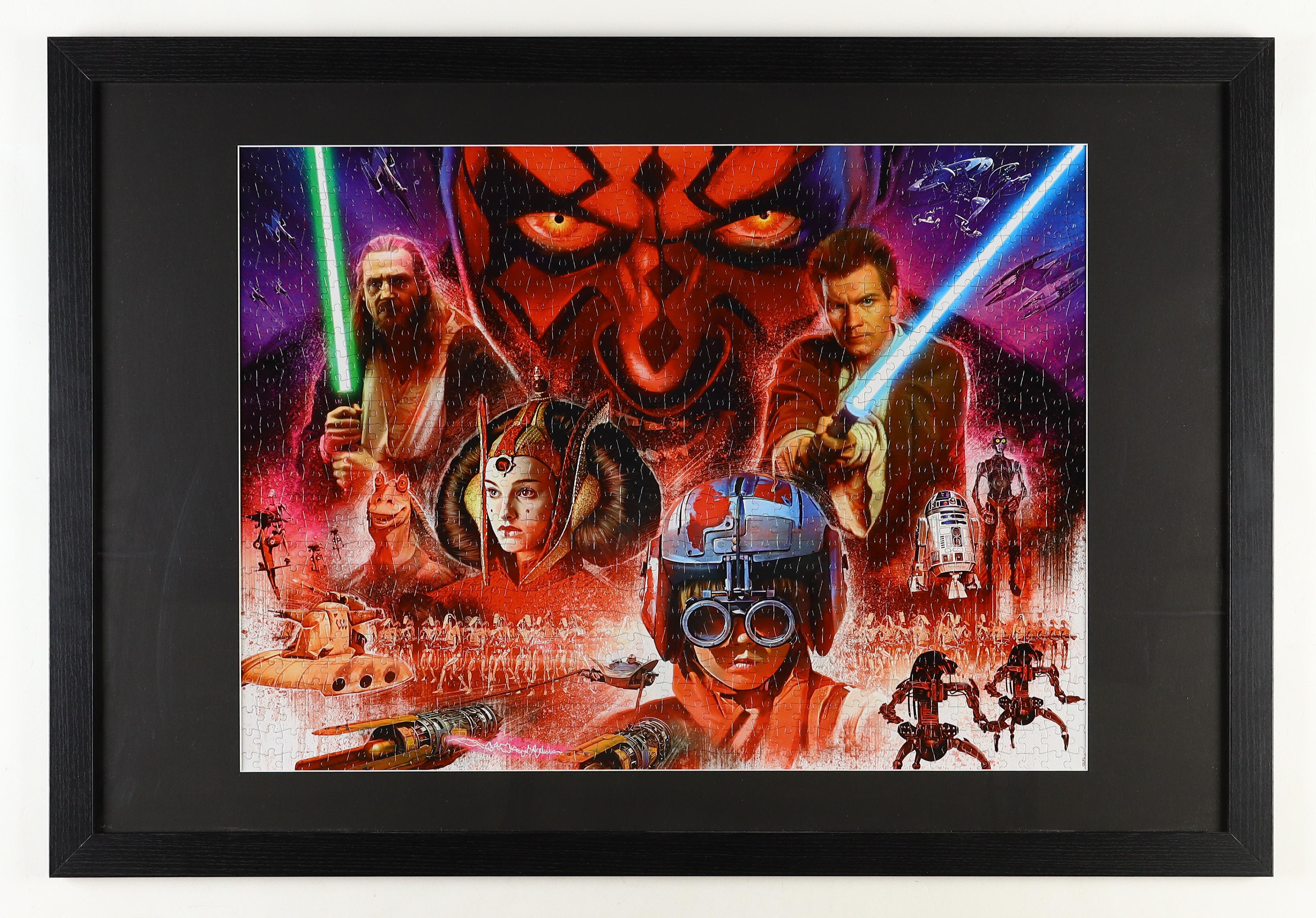 Custom frame measures approximately 26" x 38" in size and features a completed puzzle depicting "Star Wars: Episode I - The Phantom Menace" characters. Please note, the display is unsigned.