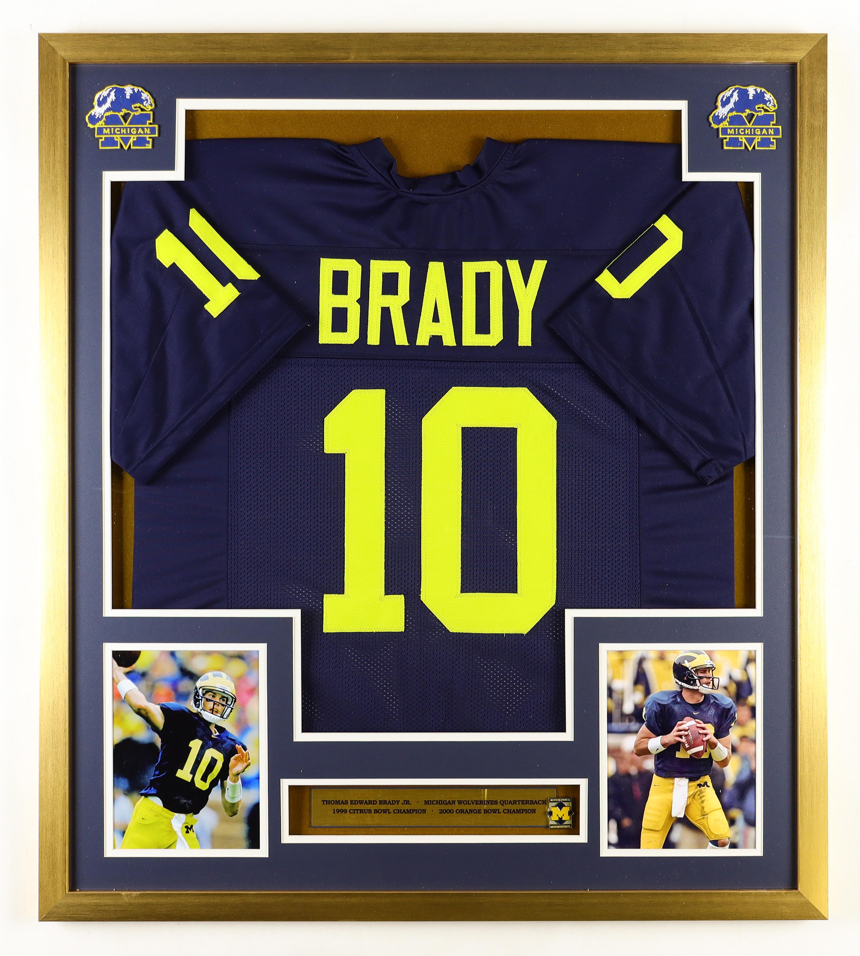 Custom framed jersey display measures approximately 33" x 36' in size and features an unsigned Tom Brady jersey. The display also includes a Michigan Wolverines Metal Football Emblem as well as (2) cloth logo patches. Please note, the display is unsigned.