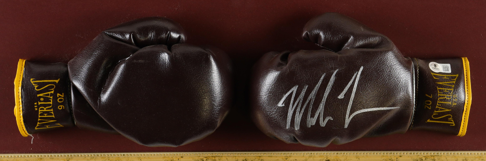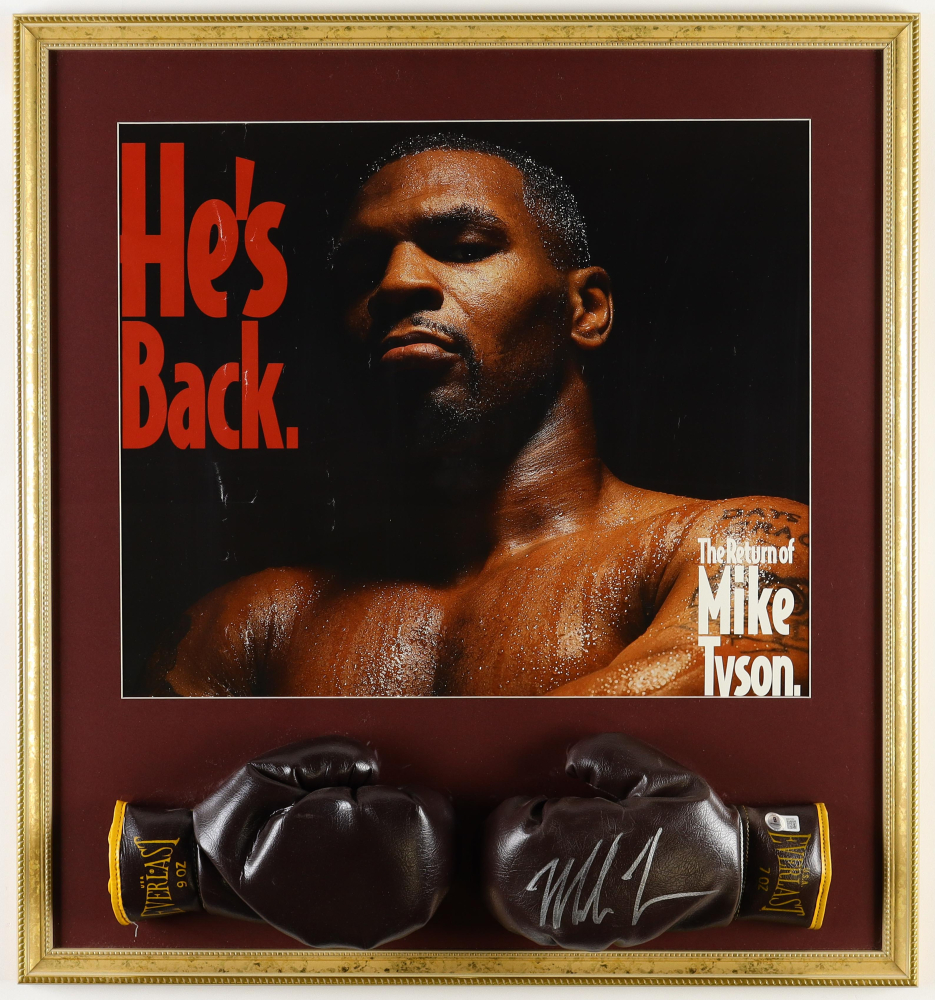 Custom frame measures approximately 22" x 26" in size and features an set of (2) brown Everlast boxing gloves. Right glove that has been hand-signed by Mike Tyson (HOF). Includes an unsigned photo. Please refer to photo for more details on the condition of the display.