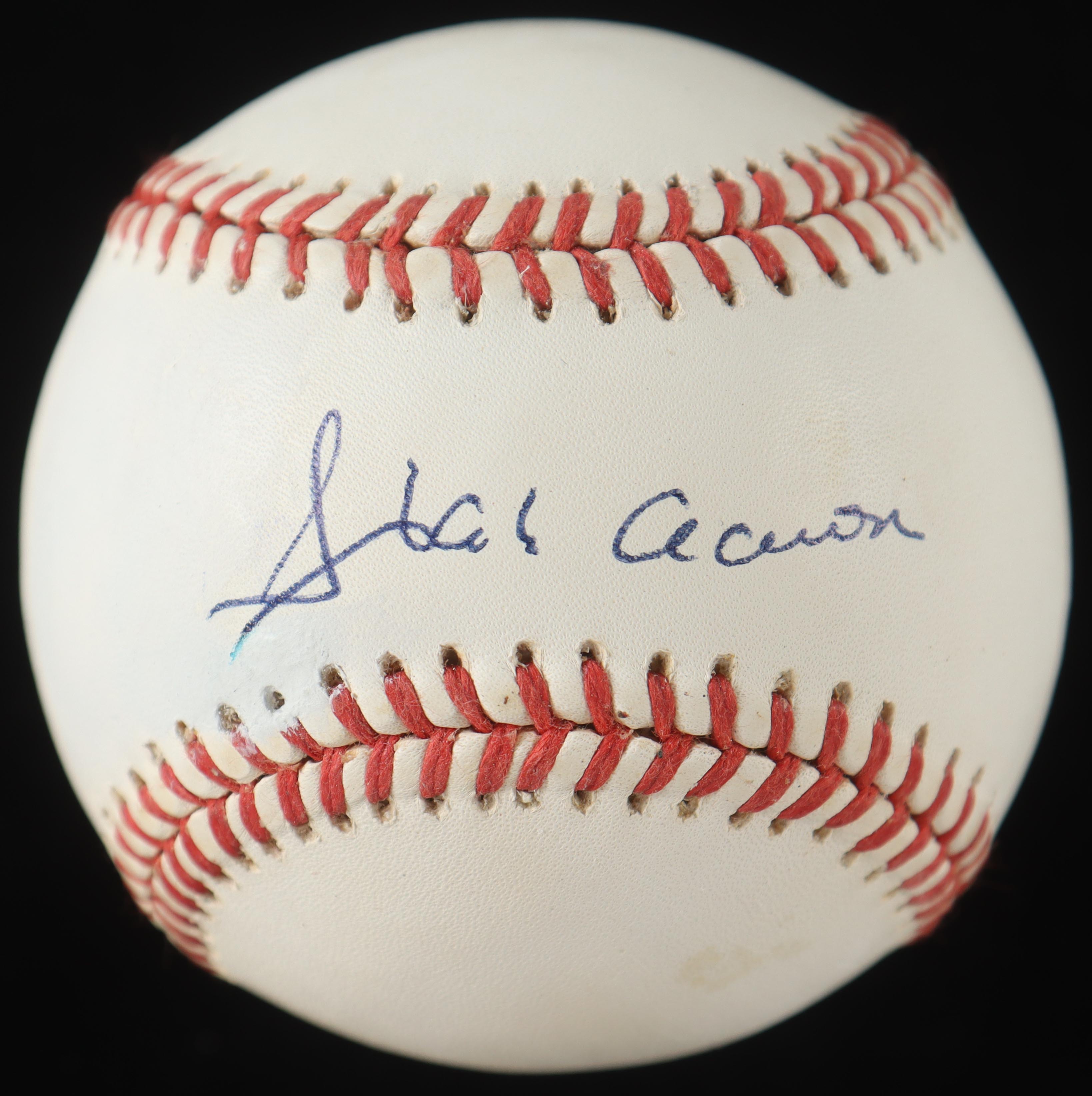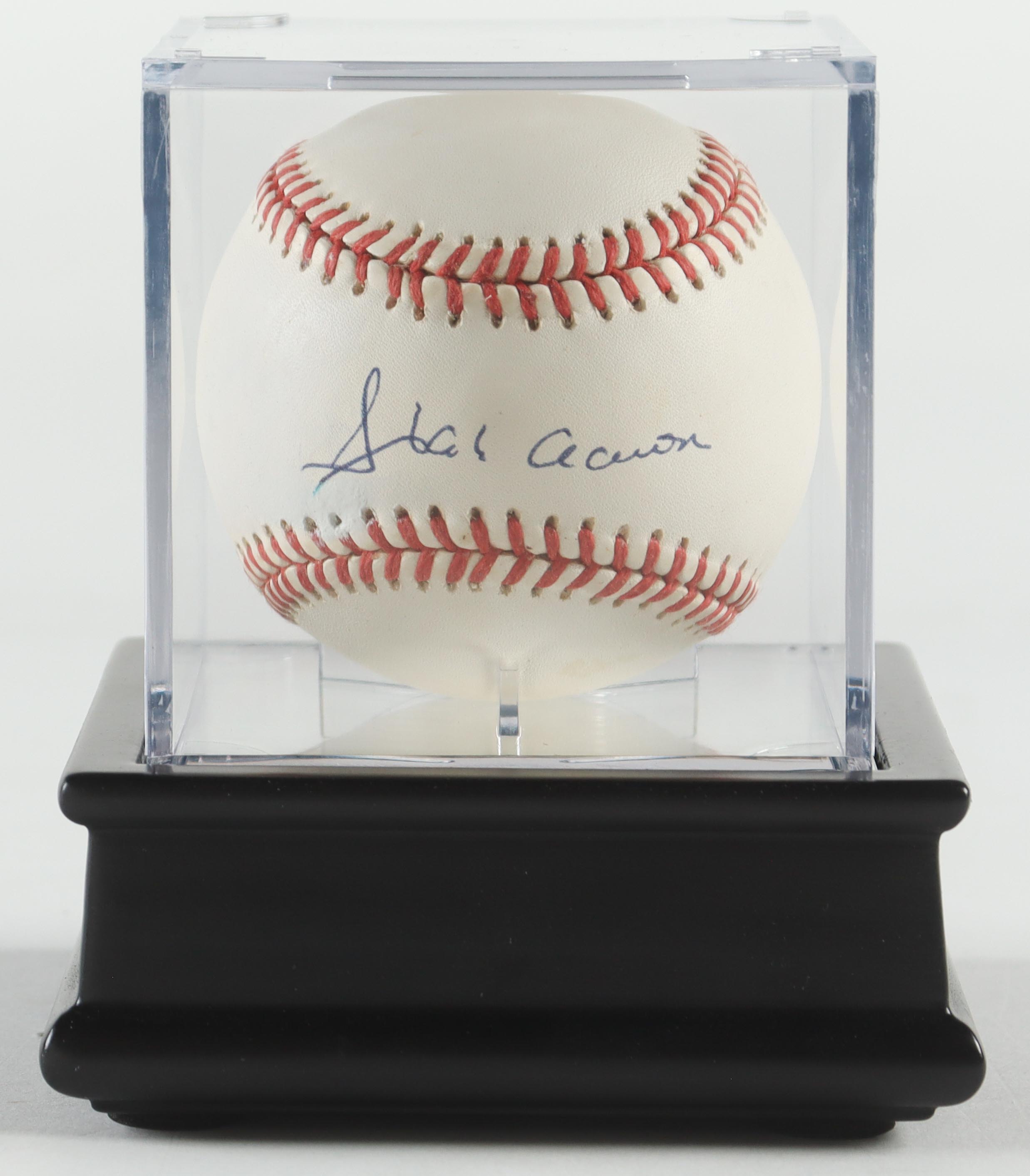Rawlings Official National League baseball. Hand-signed by Hank Aaron (D. 2021, Atlanta Braves, HOF). The display case is included as shown. Please note, the ball is naturally toned.