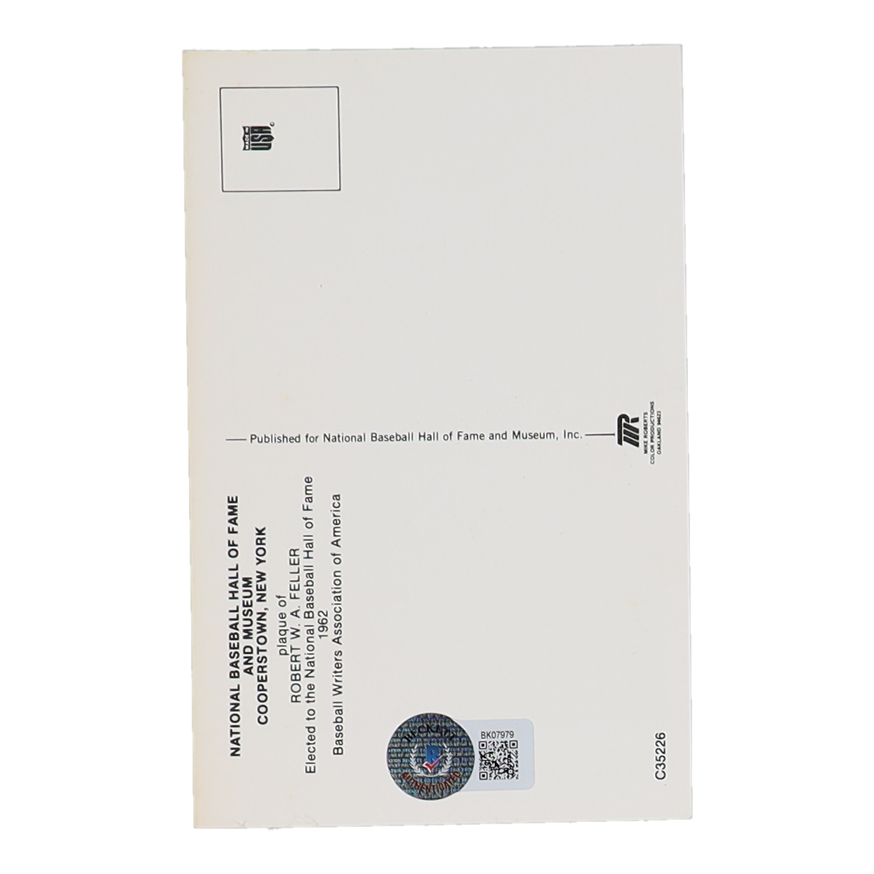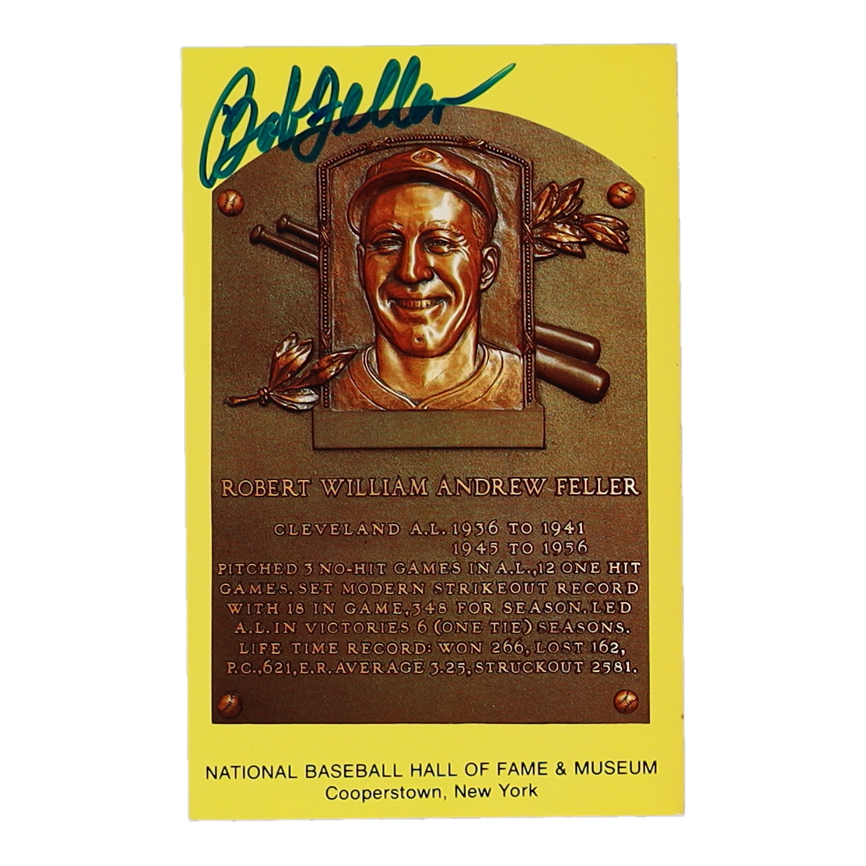Bob Feller Signed Hall of Fame Plaque Postcard (Beckett)
