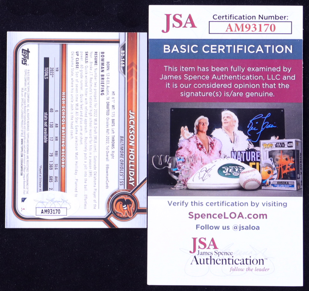 Jackson Holliday Signed 2022 Bowman Draft #BD168 RC (JSA)