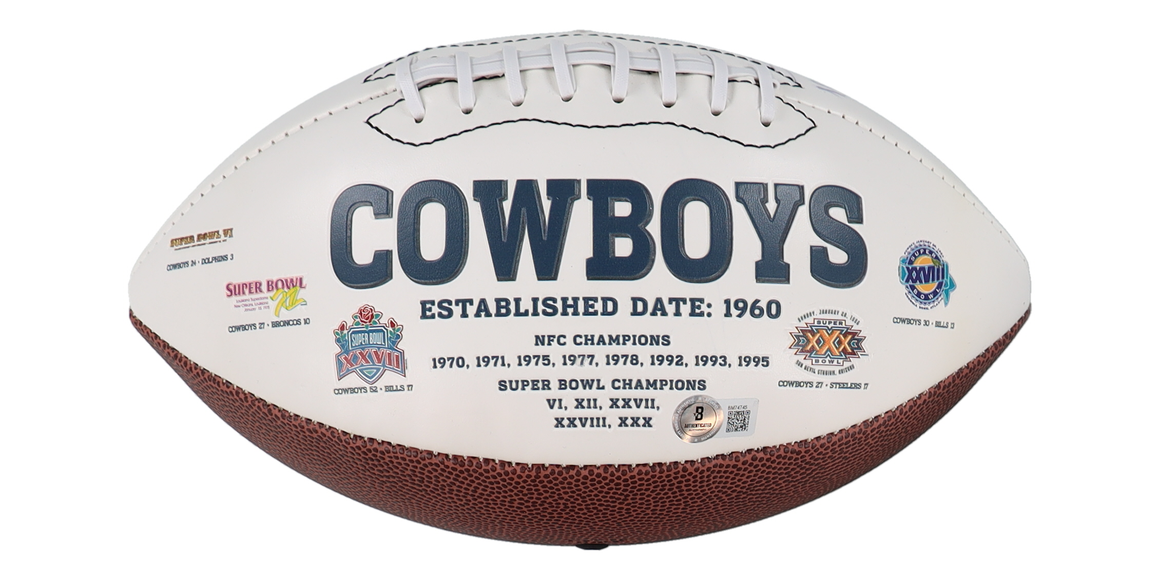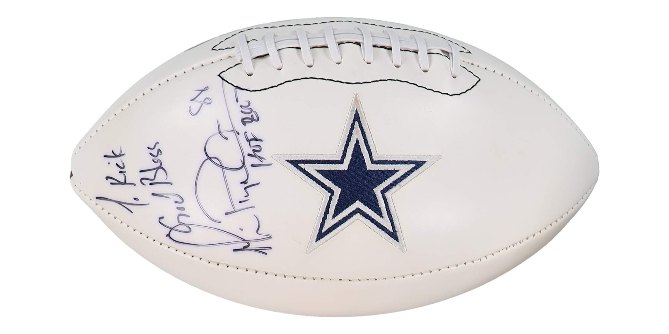 Dallas Cowboys logo football. Hand-signed and inscribed by Michael Irvin (HOF). Please note, the signature and inscriptions have bled.
