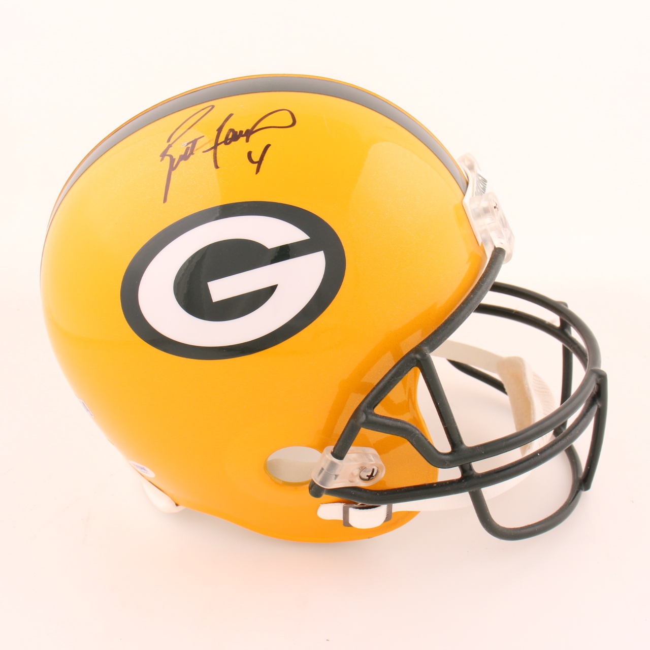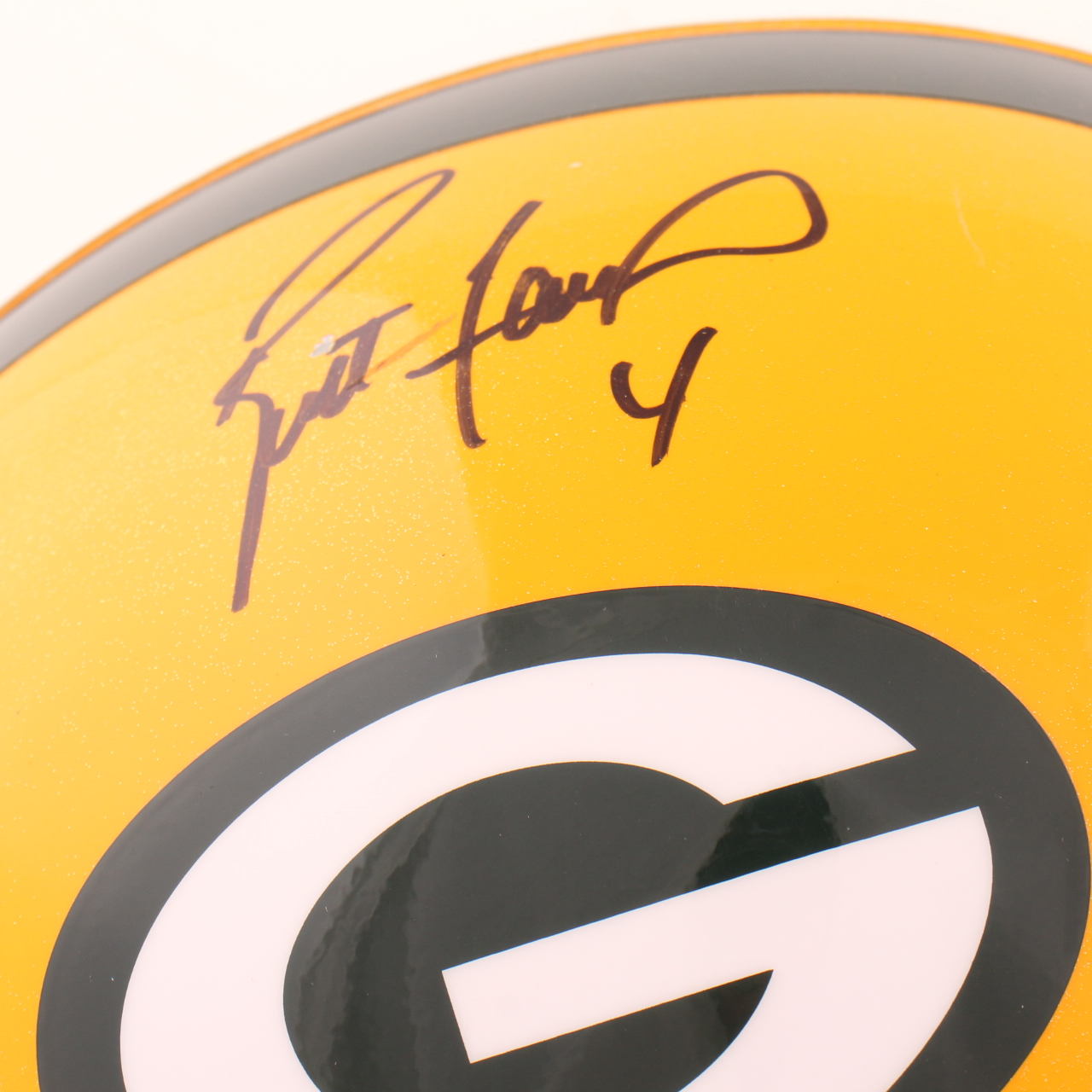 Riddell Green Bay Packers full size replica helmet. Hand-signed by Brett Favre (HOF). Please note, there is scuffing and a chip on the autograph.