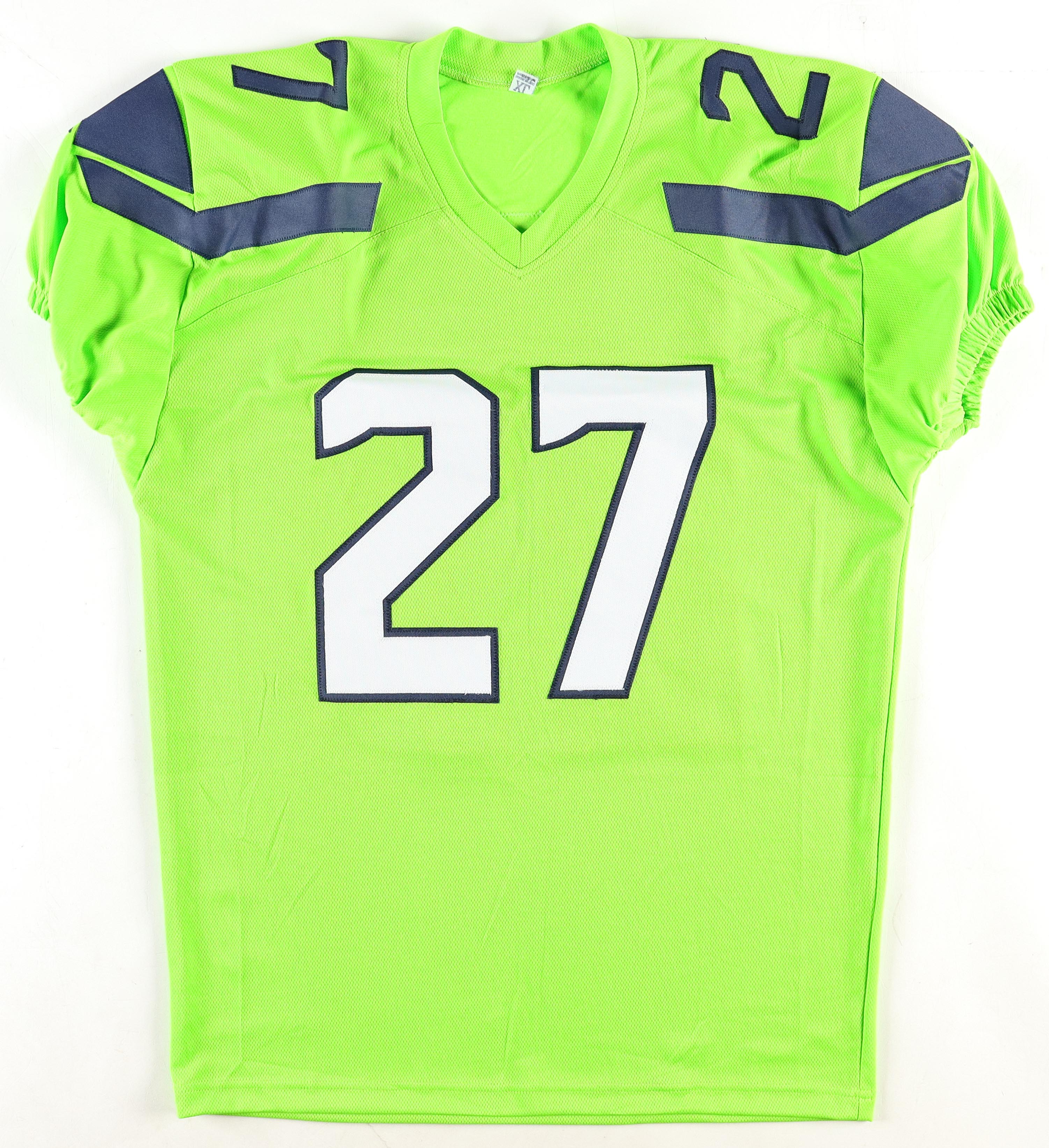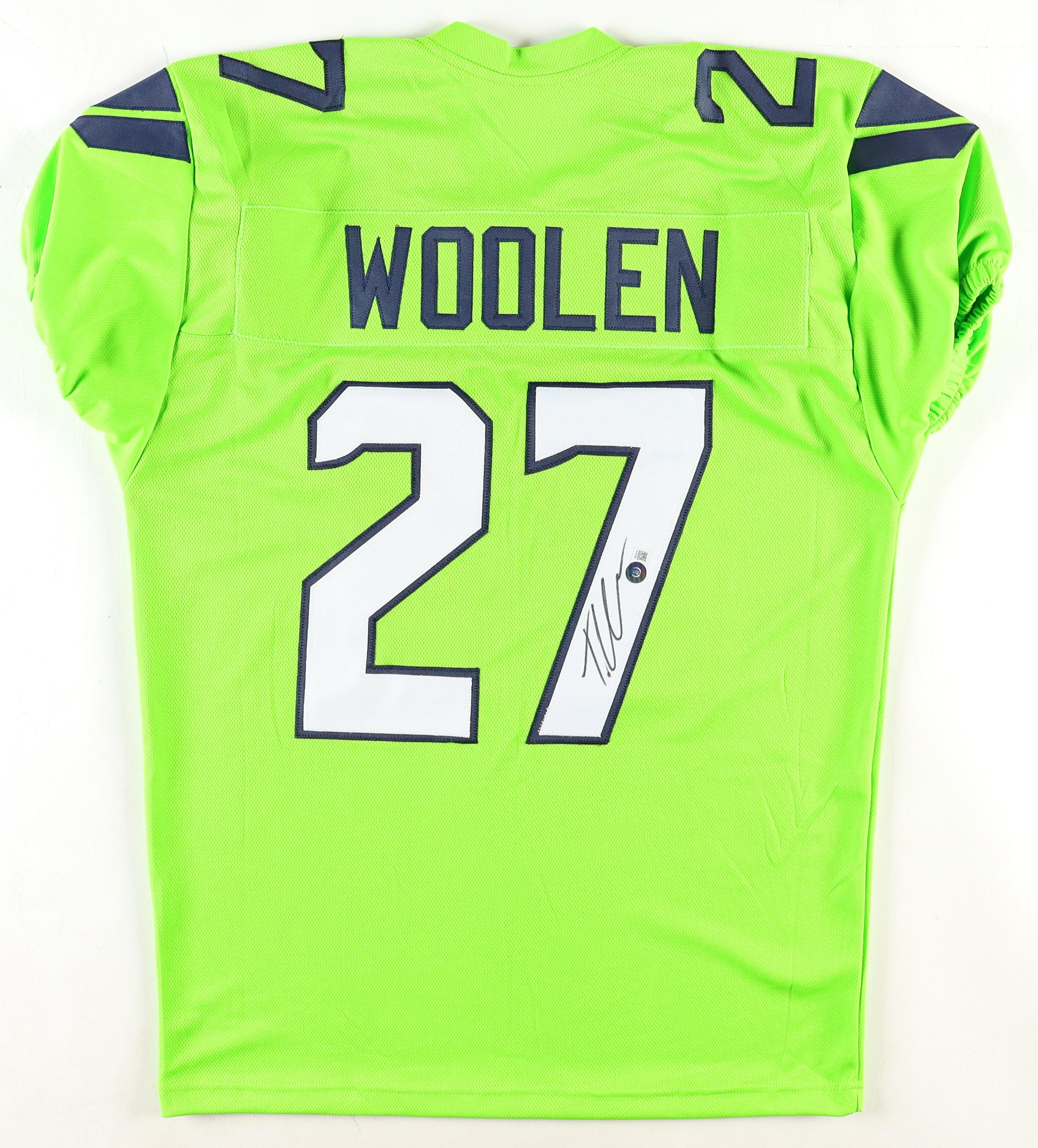 Custom jersey with everything is sewn on, size XL. Hand-signed by Tariq Woolen.