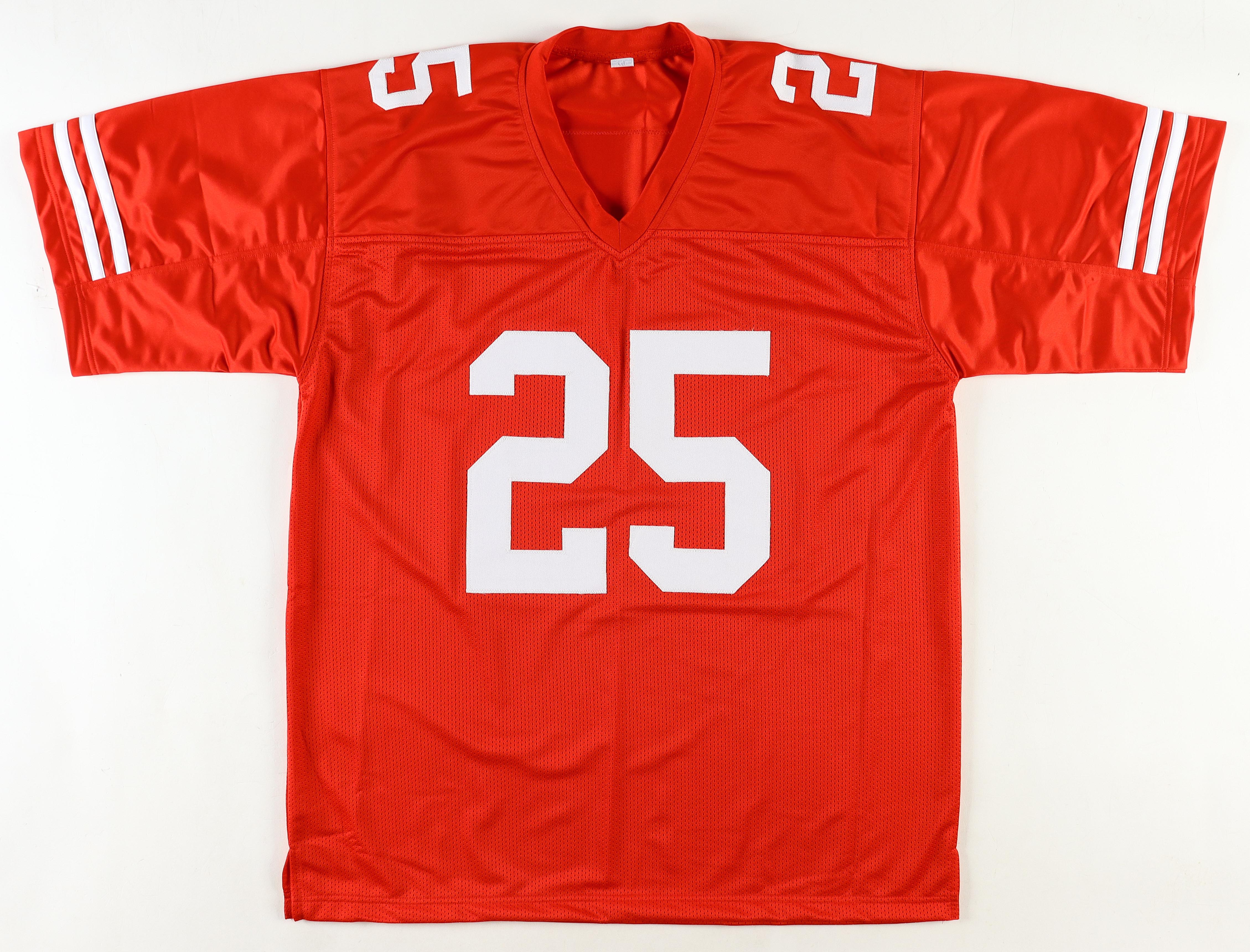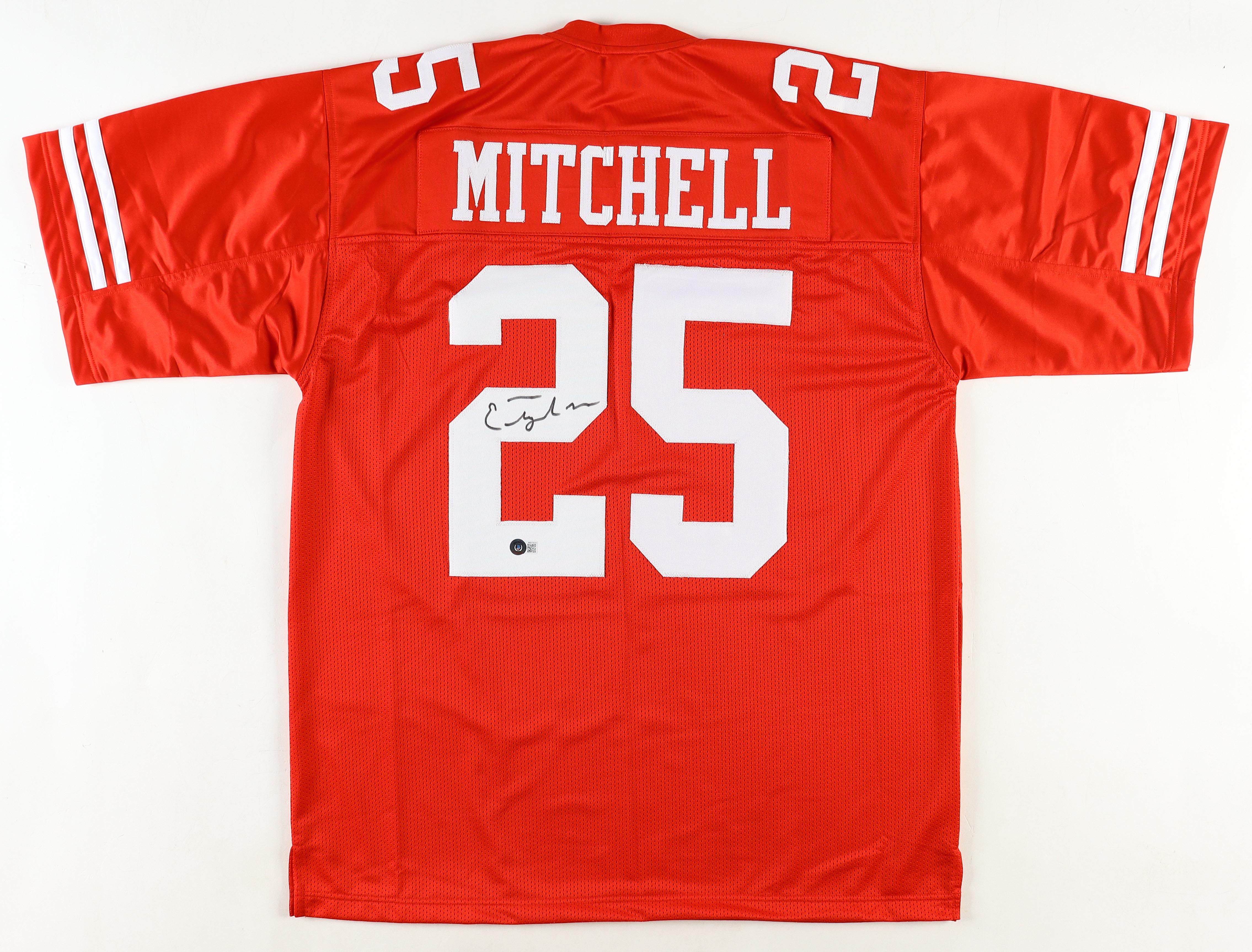 Custom jersey. Everything is sewn on, size XL. Hand-signed by Elijah Mitchell.