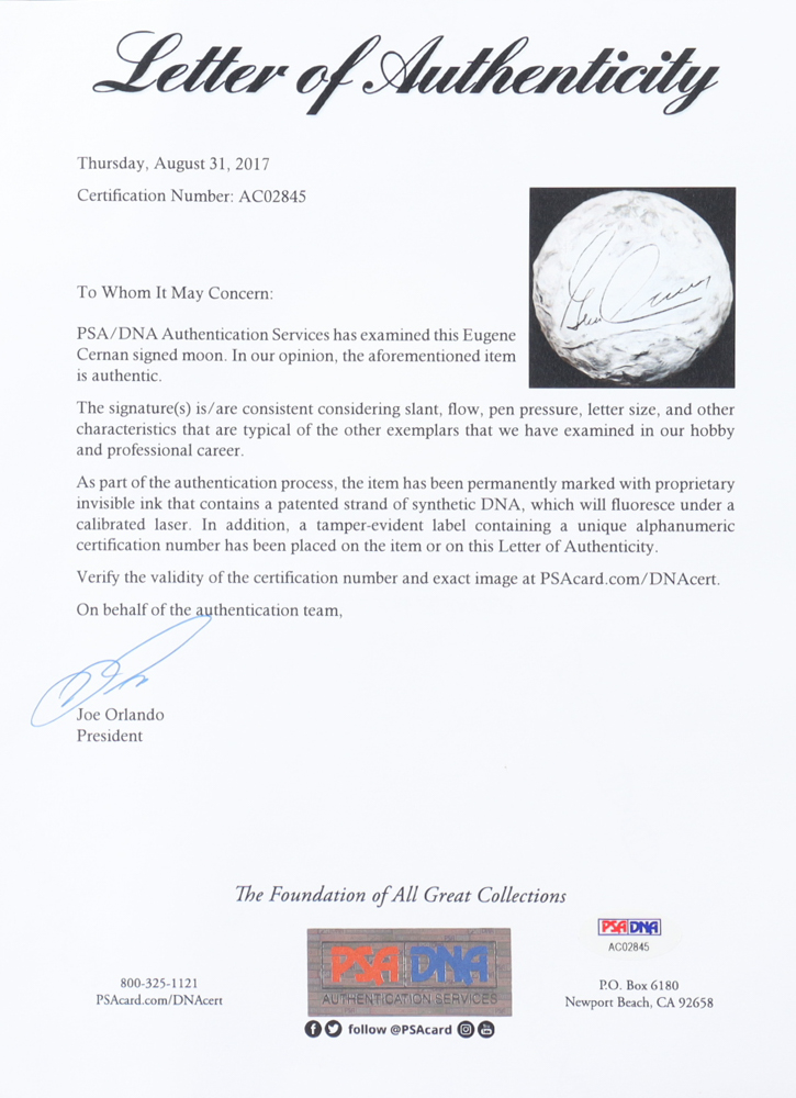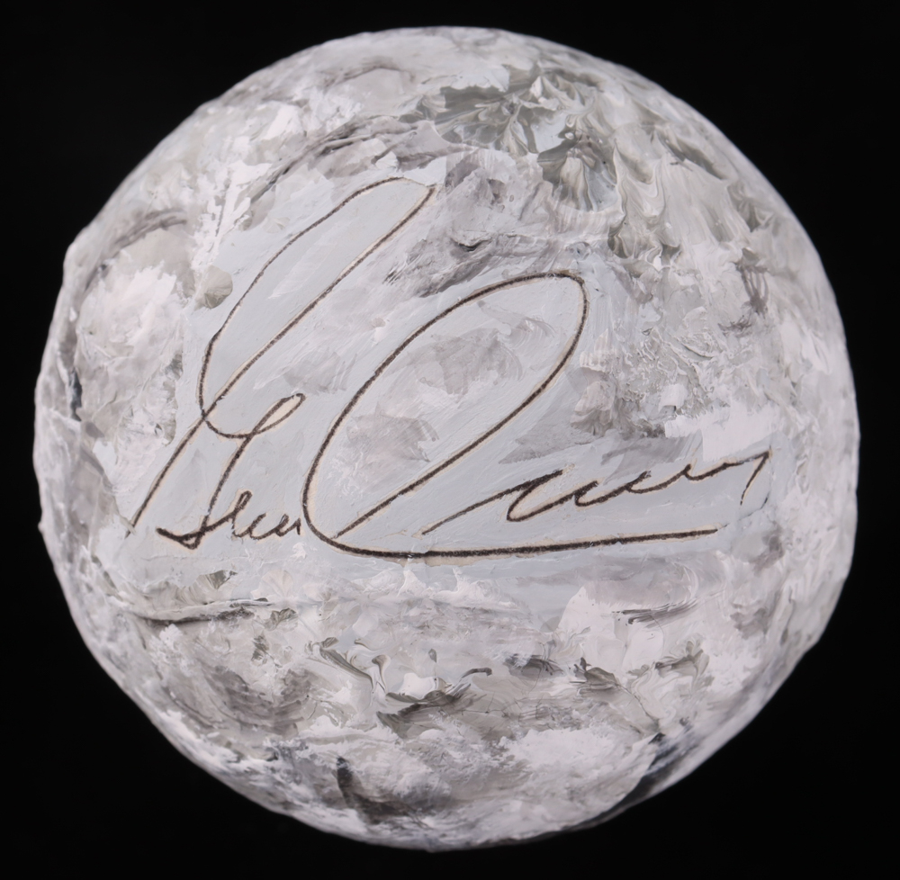 Don't miss your chance to own this extraordinary piece of space memorabilia. Place your bid now and secure your opportunity to own a signed hand-painted replica of the Moon by Apollo moonwalker Eugene Cernan, authenticated by PSA/DNA. Whether you're a collector, a space enthusiast, or simply someone who appreciates the wonders of the universe, this replica is certain to become a cherished centerpiece of your collection. Bid now and let the legacy of Apollo 17 inspire your own journey of discovery!"