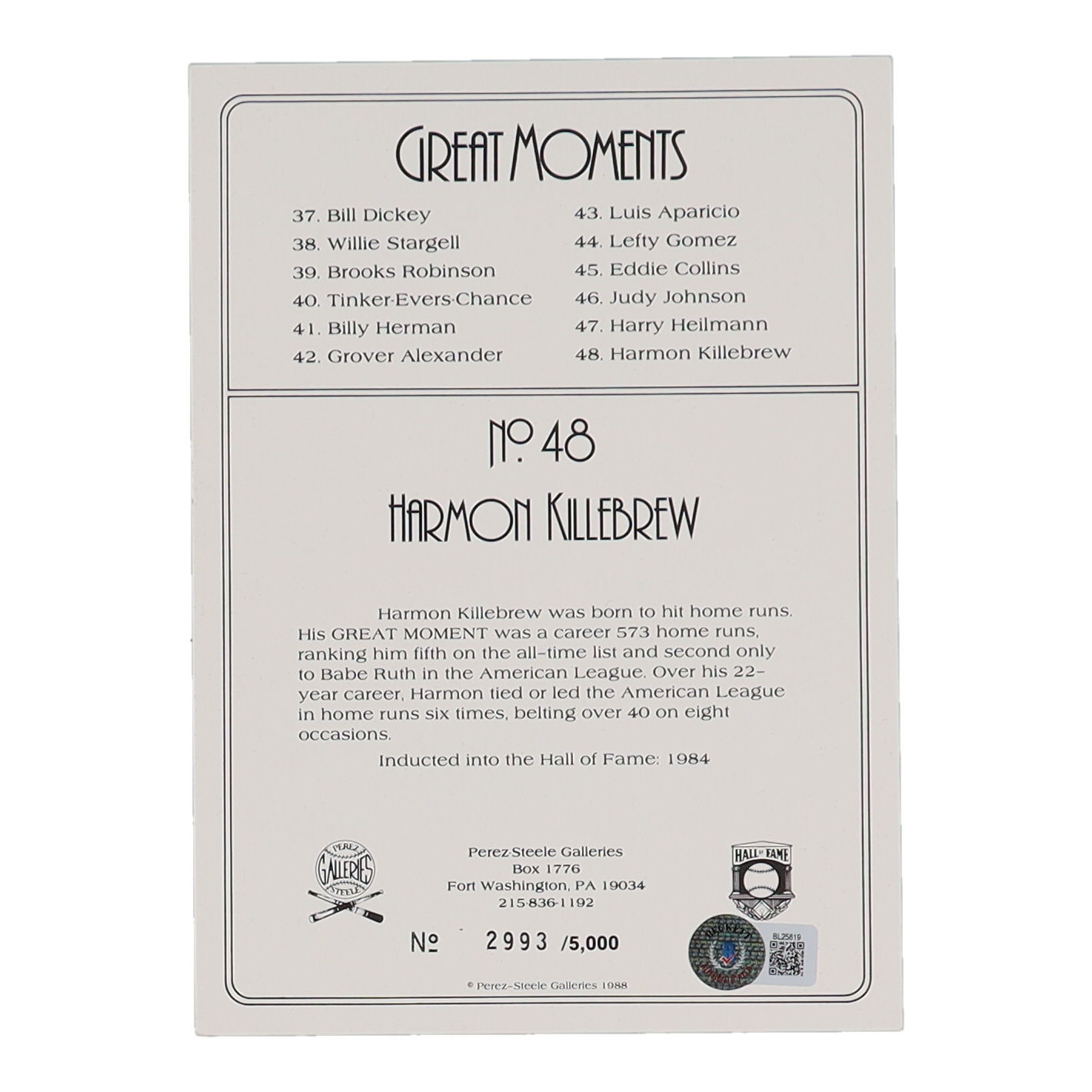 Harmon Killebrew Signed LE 1988 Perez-Steele Great Moments #48 (Beckett)