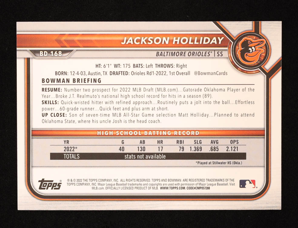 Jackson Holliday 2022 Bowman Draft #BD168 RC