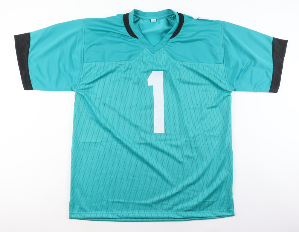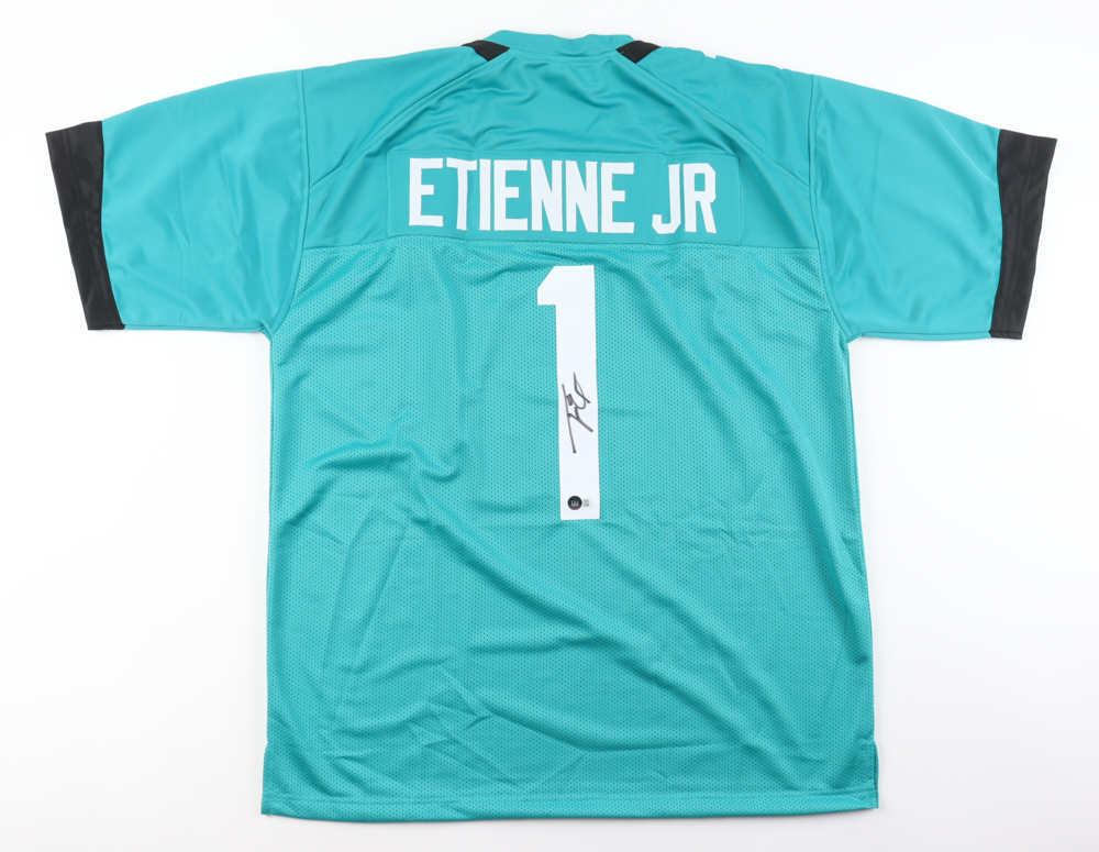 Custom jersey with everything sewn on, size XL. Hand-signed by Travis Etienne Jr.