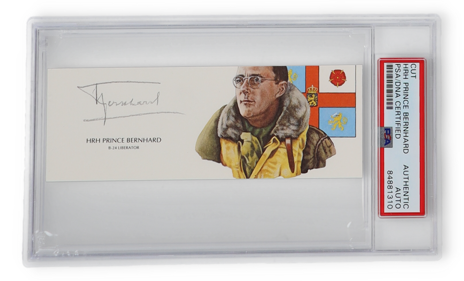 Calling all collectors and admirers of royalty and history! Up for auction is a truly exceptional piece—a signed cut signature of HRH Prince Bernhard, encapsulated and authenticated by the esteemed PSA/DNA authentication services.