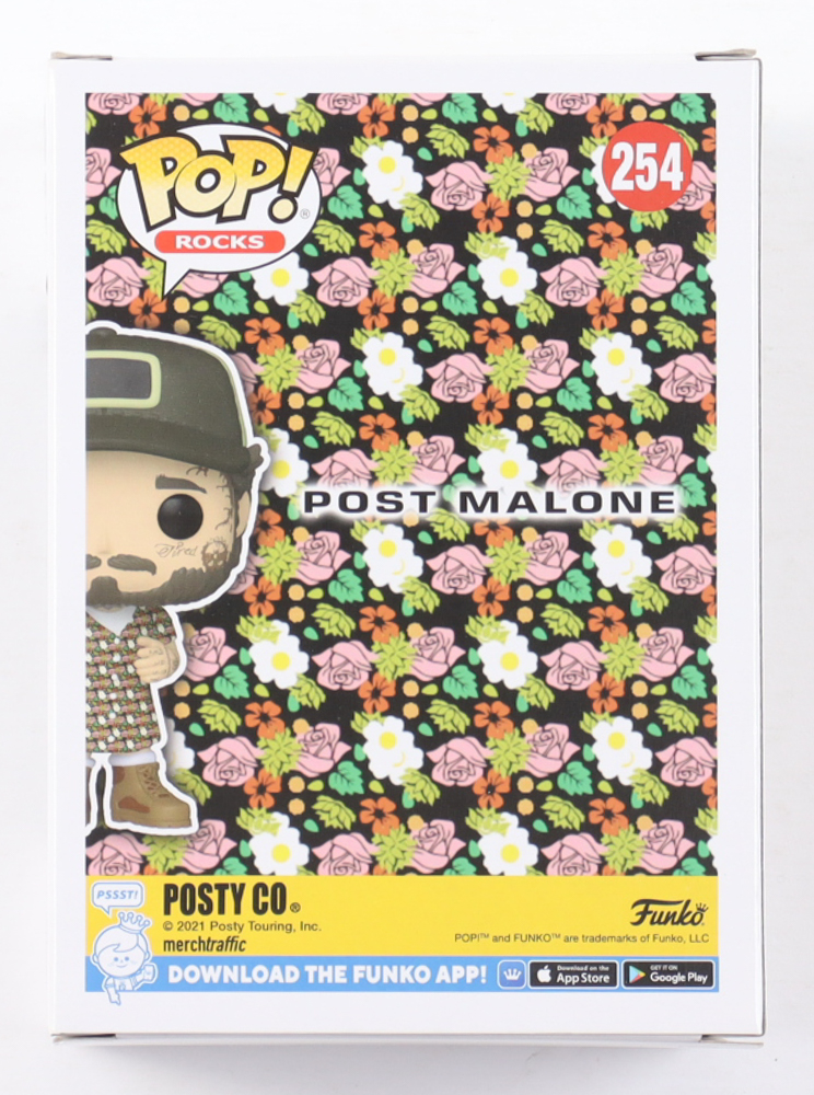 Vinyl figure measures approximately 4" tall and has been hand-signed by Post Malone. Please note, there is scuffing on the window.