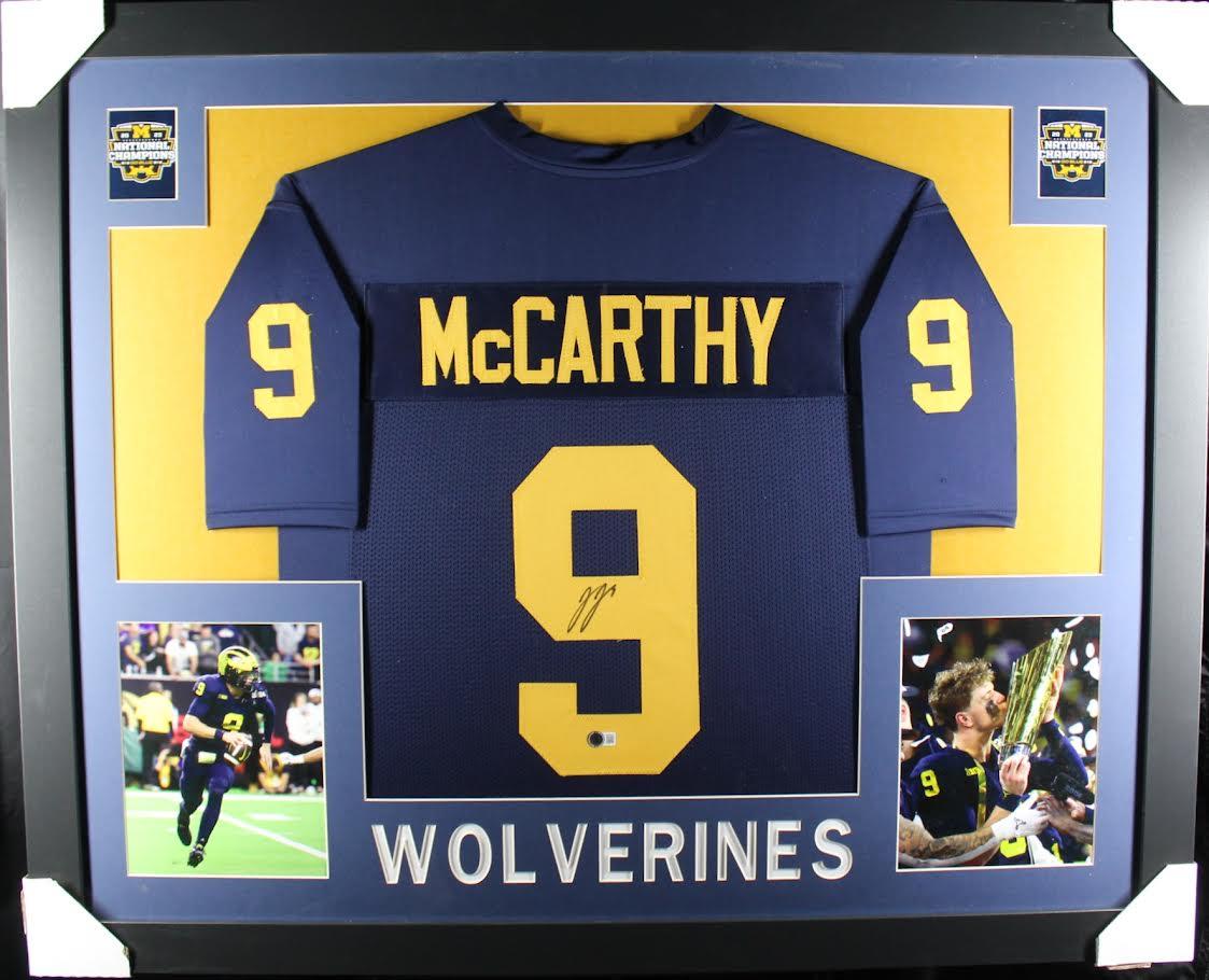 Custom frame measures approximately 35" x 43" in size and features a jersey hand-signed by JJ Mccarthy.