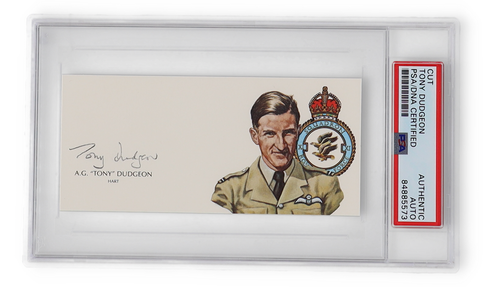 Take flight into the heroic exploits of World War II with this exceptional offering: a signed cut signature of RAF pilot Tony Dudgeon. Authenticated and encapsulated by PSA/DNA, this signature encapsulates the bravery and valor of a distinguished RAF pilot.