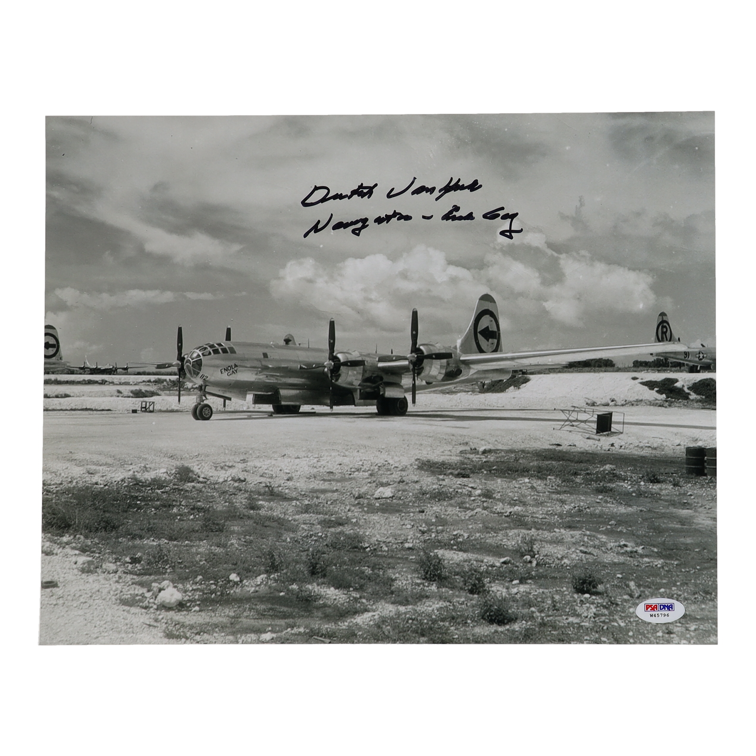 Embark on a journey back in time with this extraordinary auction offering! Presented for bidding is a captivating 11x14 photograph featuring Dutch Van Kirk, the navigator of the Enola Gay, authenticated by PSA/DNA authentication services.