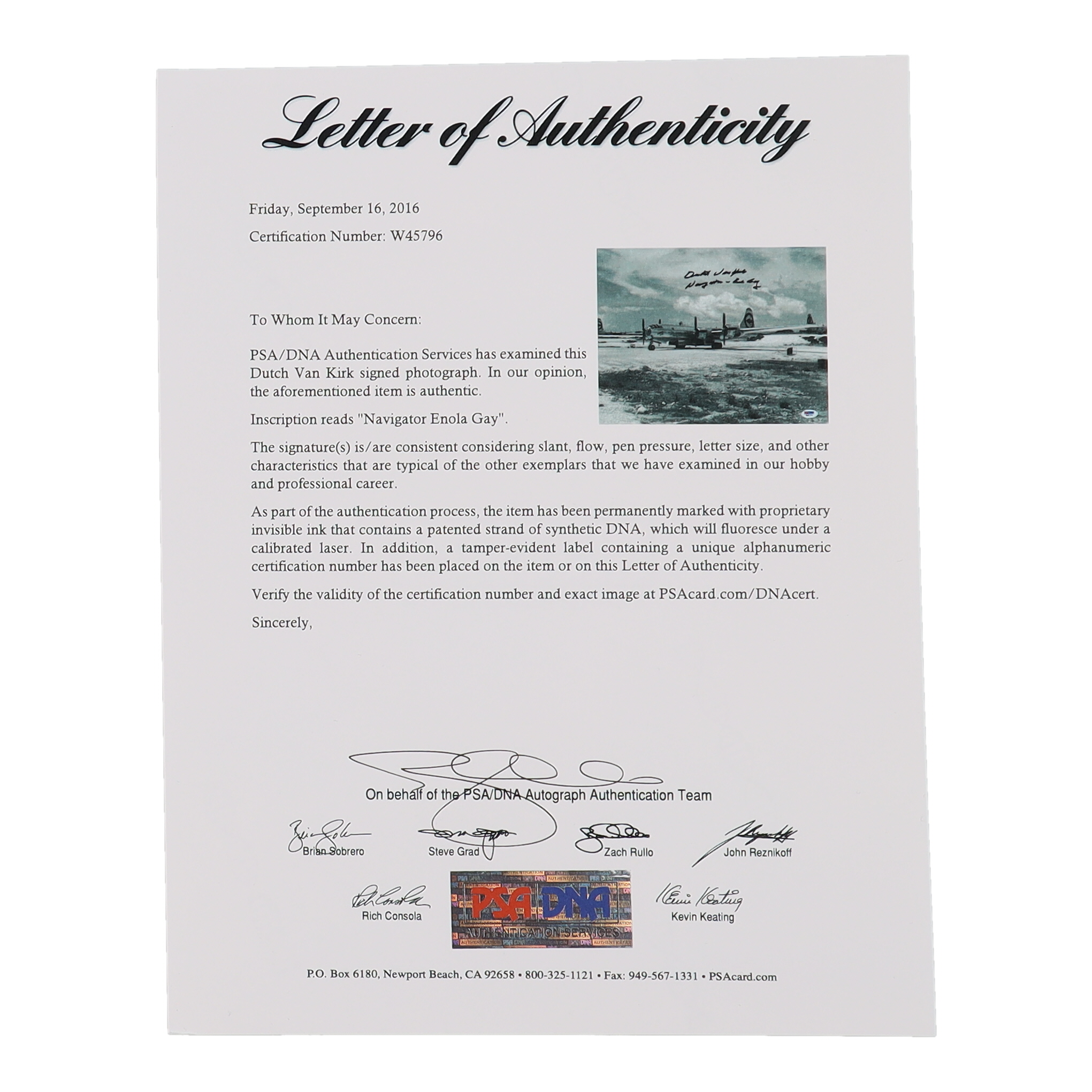 Don't miss your chance to own this captivating piece of historical memorabilia. Place your bid now and secure your opportunity to own a signed photograph of Dutch Van Kirk, authenticated by PSA/DNA. Whether you're a collector, a history enthusiast, or simply someone who appreciates the significance of this momentous event, this photograph is sure to become a cherished addition to your collection. Bid now and make this piece of history yours!
