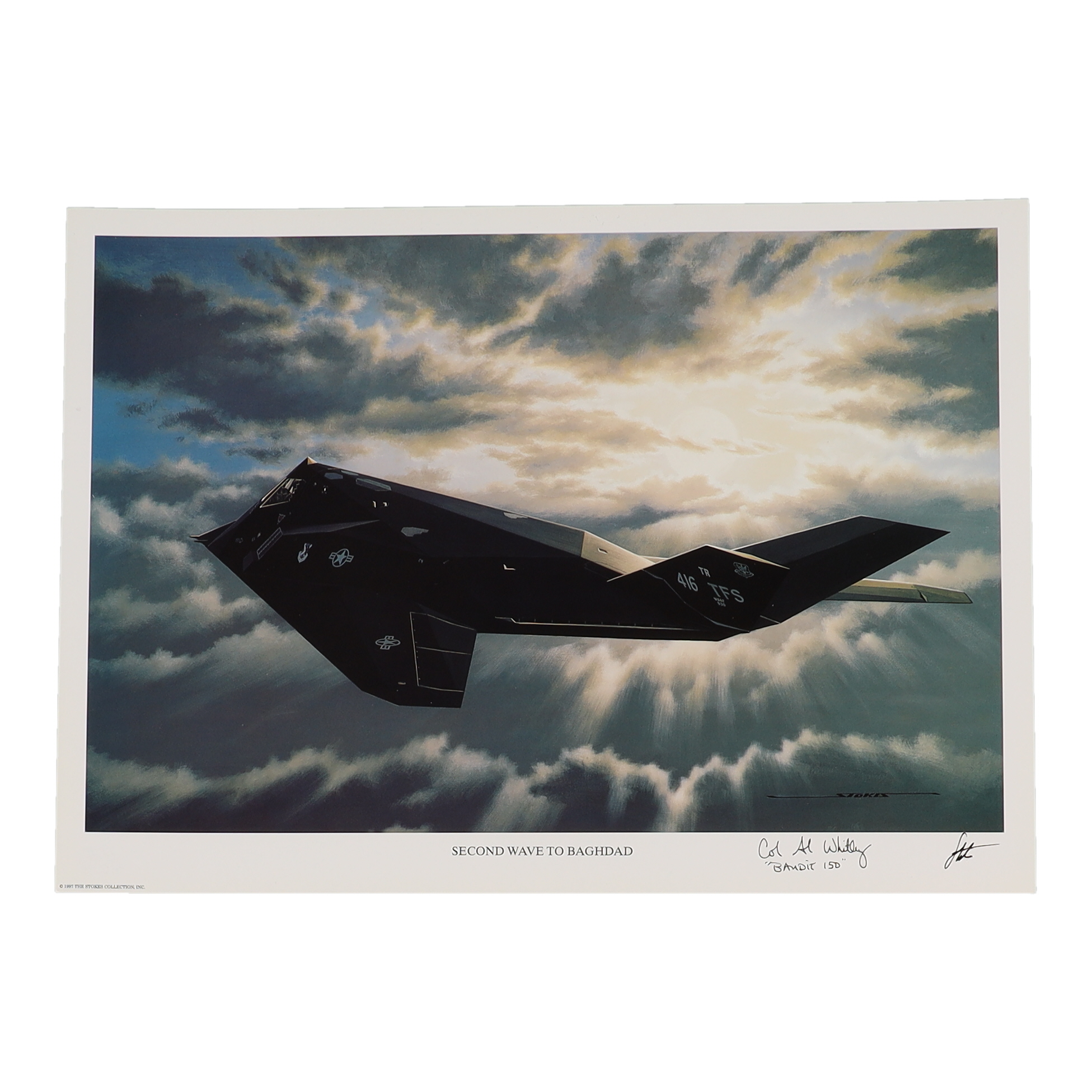 Don't miss your chance to own this rare piece of military memorabilia. Bid now and make this hand-signed Stan Stokes lithograph of """"Second Wave to Baghdad,"""" authenticated by AI-Verified authentication services, the centerpiece of your collection. Honor the bravery and leadership of Alton Whitney and commemorate the courage of all those who served in this pivotal campaign. Place your bid today and let this extraordinary piece of history become a cherished part of your collection! ""