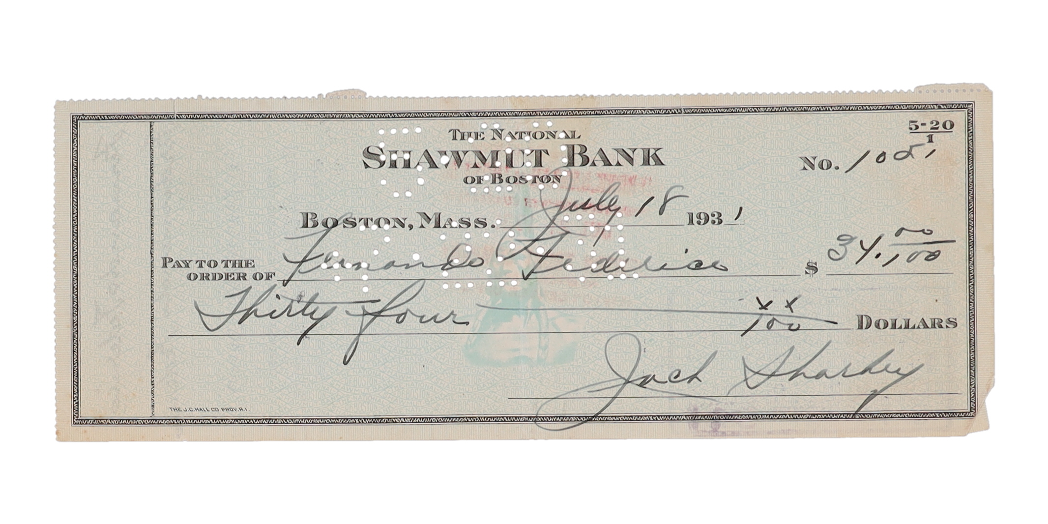 Personal bank check dated July 18th, 1931. Hand-signed by Jack Sharkey (D. 1994, HOF).