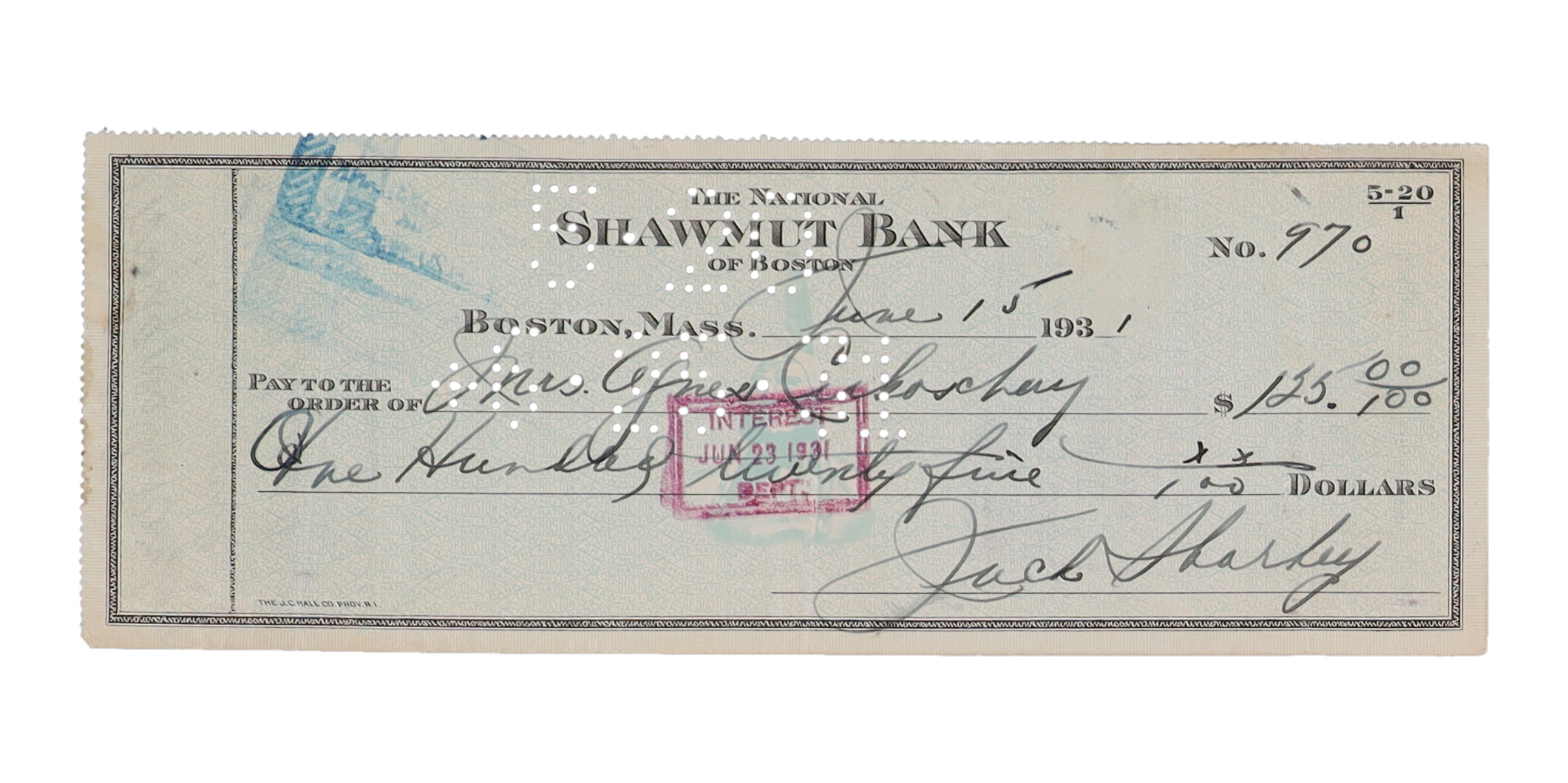 Personal bank check dated June 15th, 1931. Hand-signed by Jack Sharkey (D. 1994, HOF).