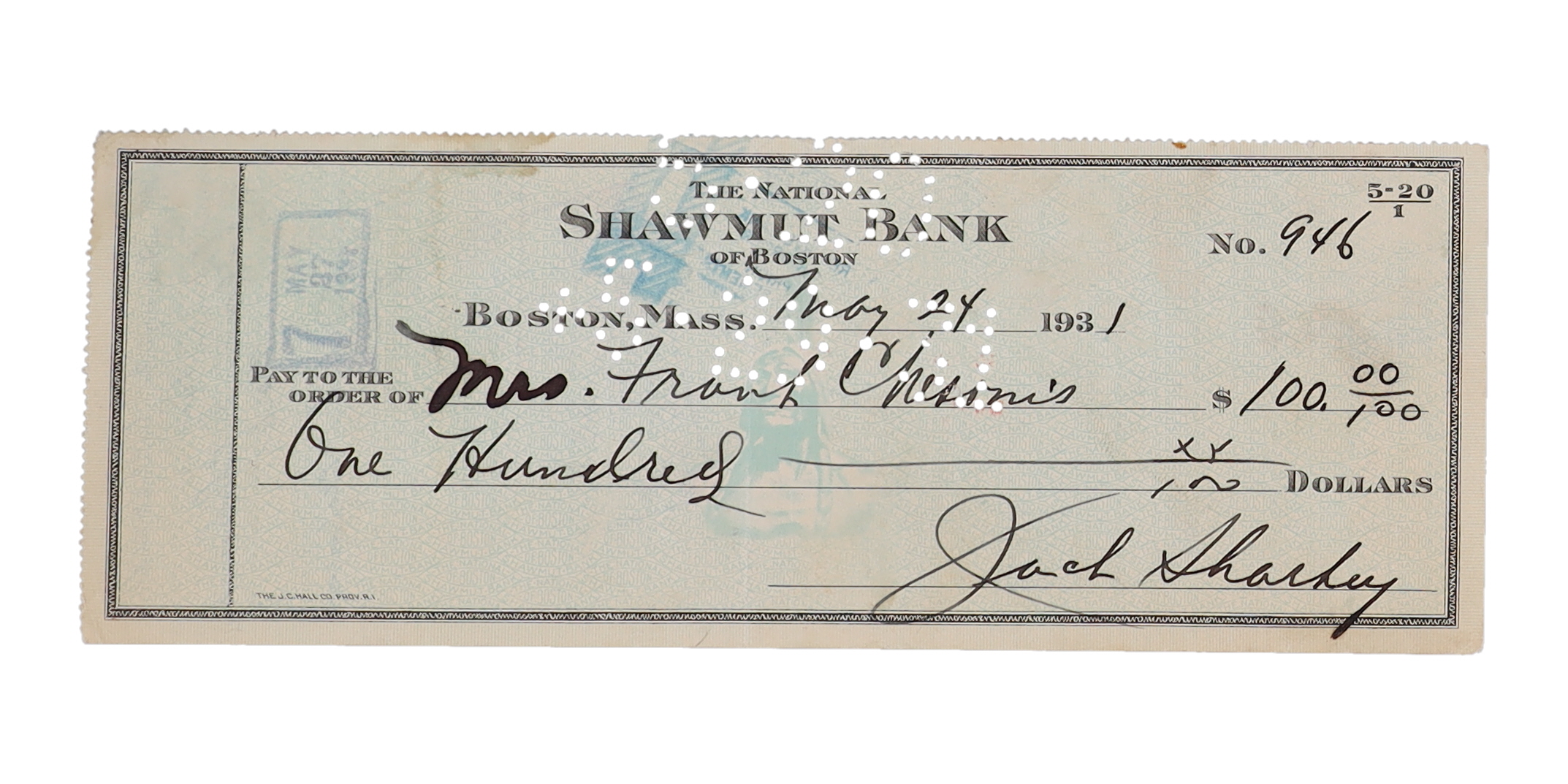Personal bank check dated May 24th, 1931. Hand-signed by Jack Sharkey (D. 1994, HOF).