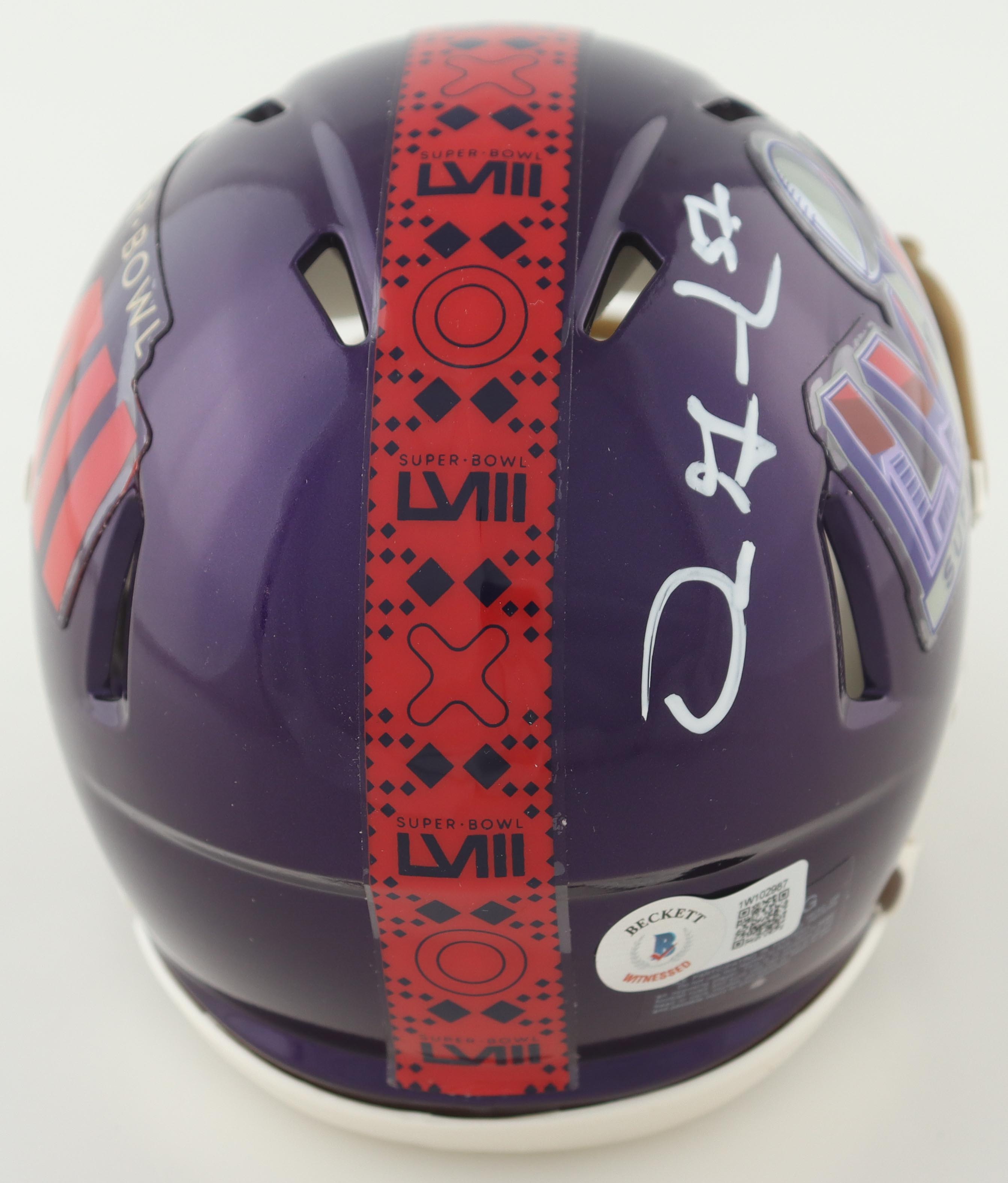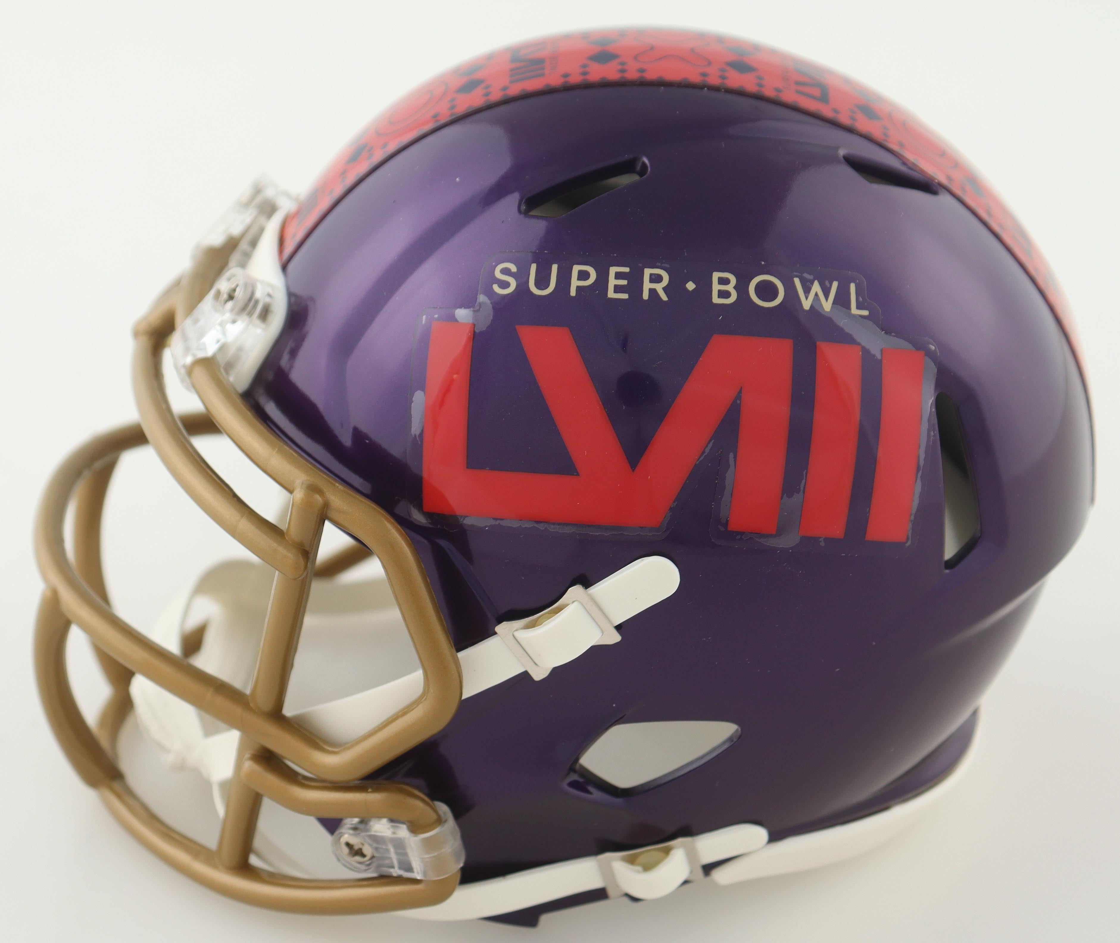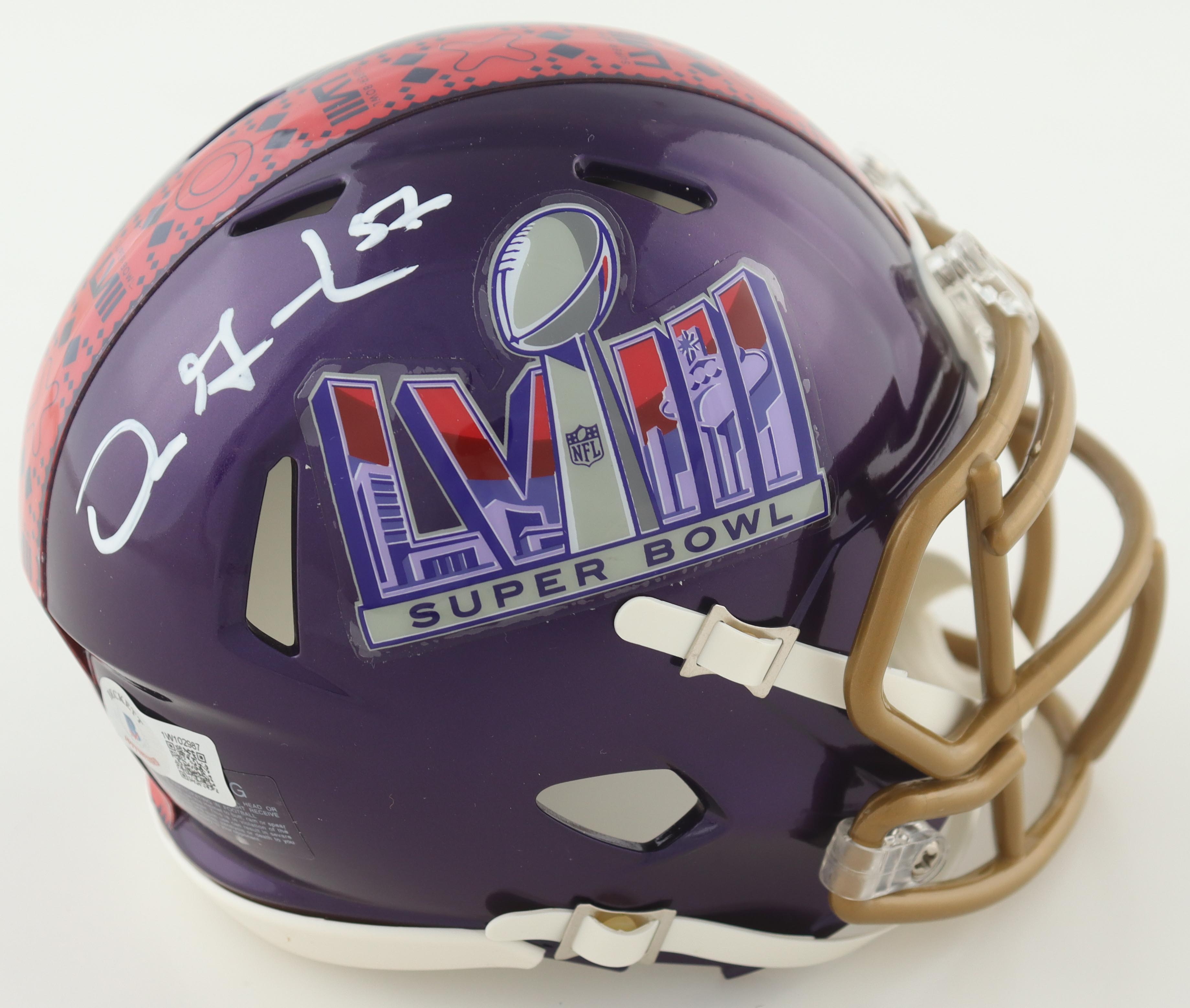 Riddell Super Bowl LVIII logo speed mini helmet. Hand-signed by Dre Greenlaw.