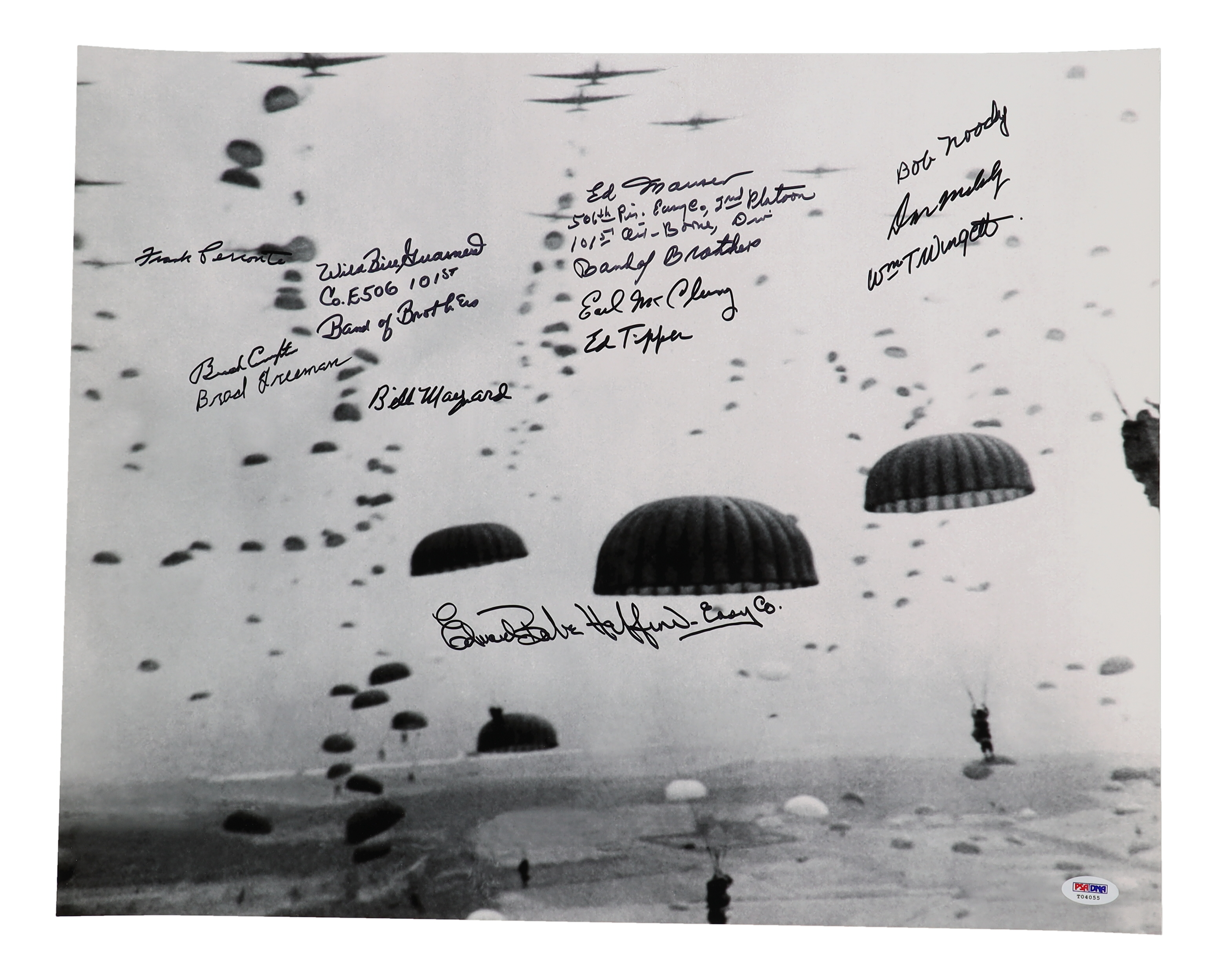 """ Prepare to relive the daring Operation Market Garden with this extraordinary auction offering! Up for bidding is a riveting 16x20 photograph commemorating the historic WWII operation, authenticated by PSA/DNA authentication services and signed by 12 distinguished veterans of the 101st Airborne Division. Among the signatories are renowned """"Band of Brothers"""" Frank Perconte, Lynn """"Buck"""" Compton, and other esteemed veterans who bravely fought in one of the war's most ambitious campaigns.