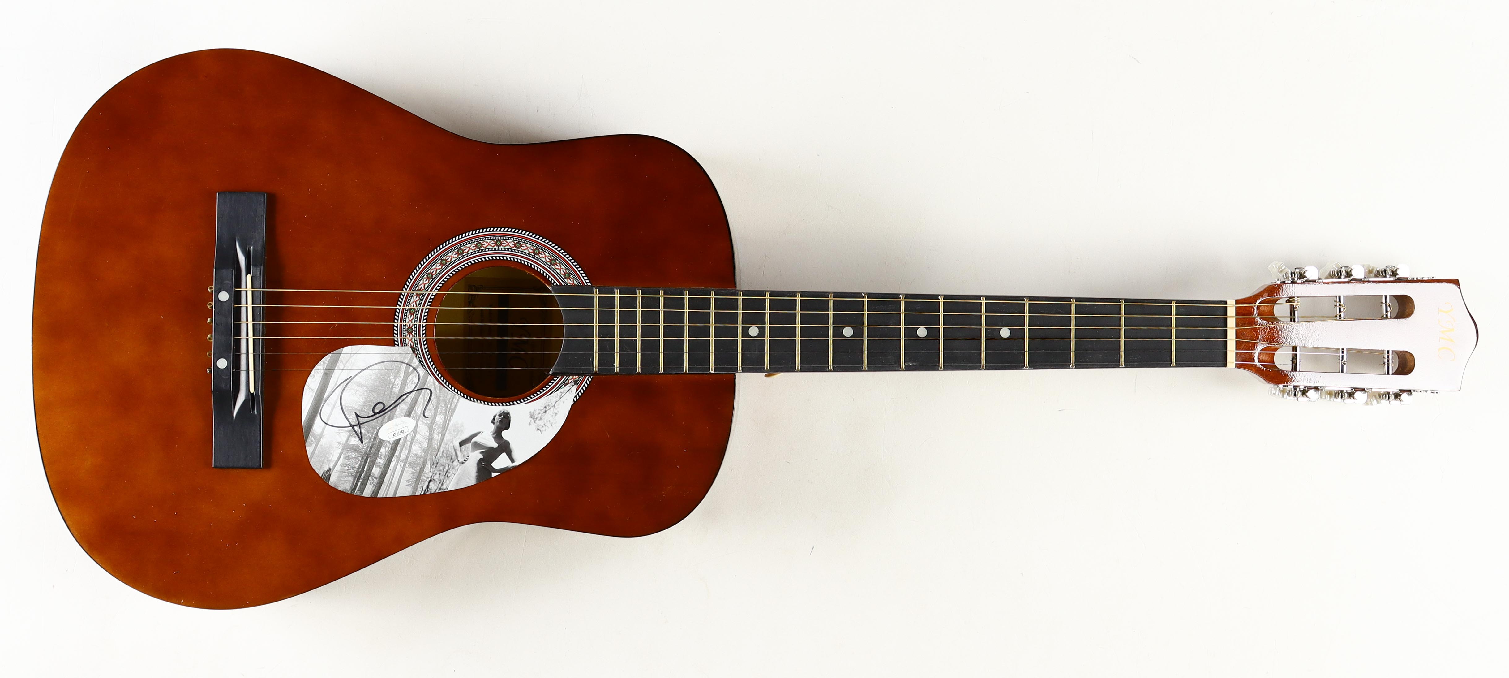 YMC beginner Acoustic guitar measures approximately 38" in length and has been hand-signed on a CD cover that has been repurposed as a pick-guard by Taylor Swift. Please note the excess glue around the pick guard.