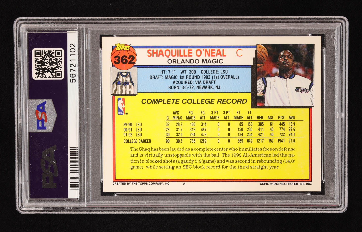 Shaquille O'Neal 1992-93 Topps #362 RC (PSA 9)