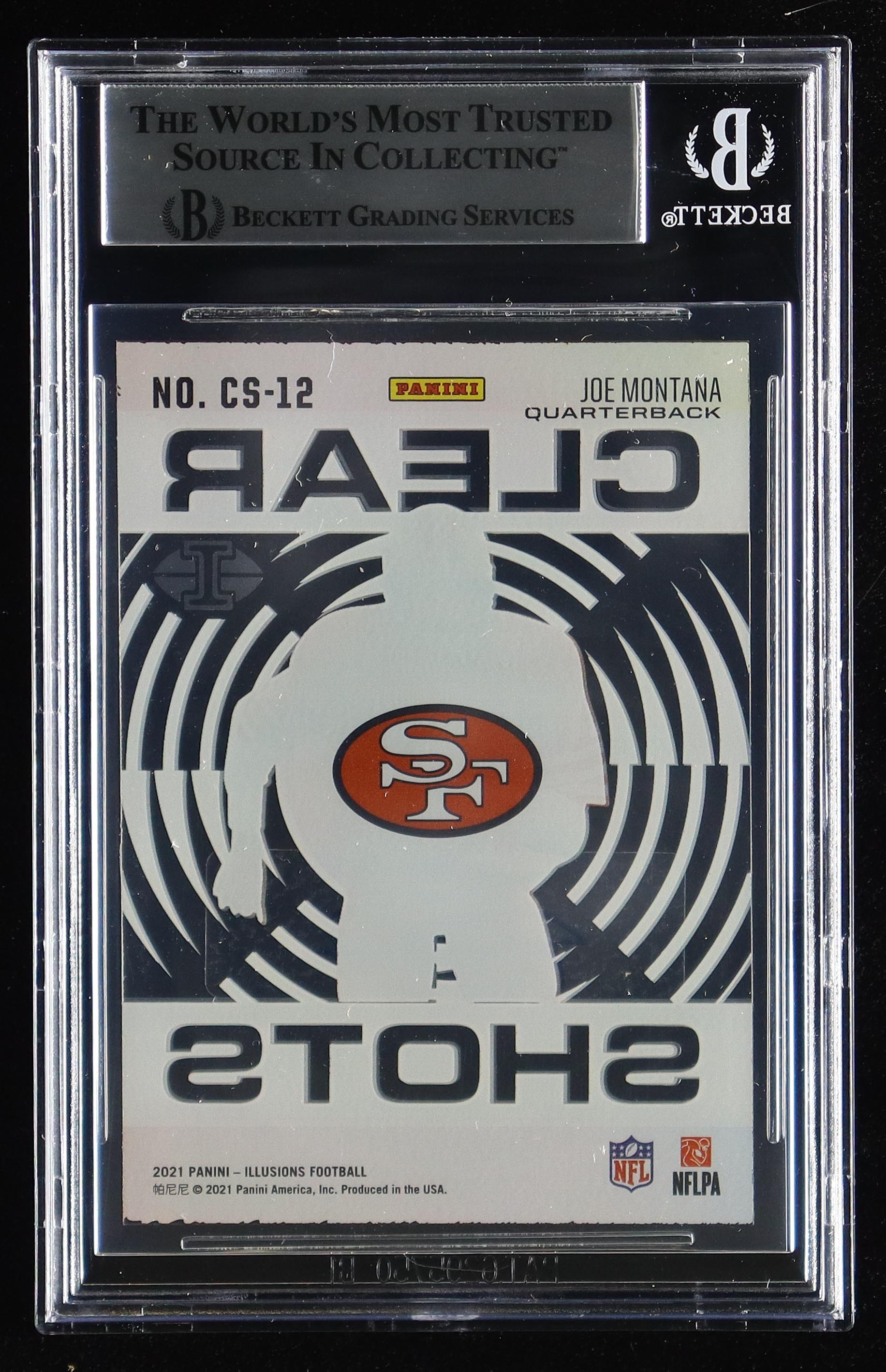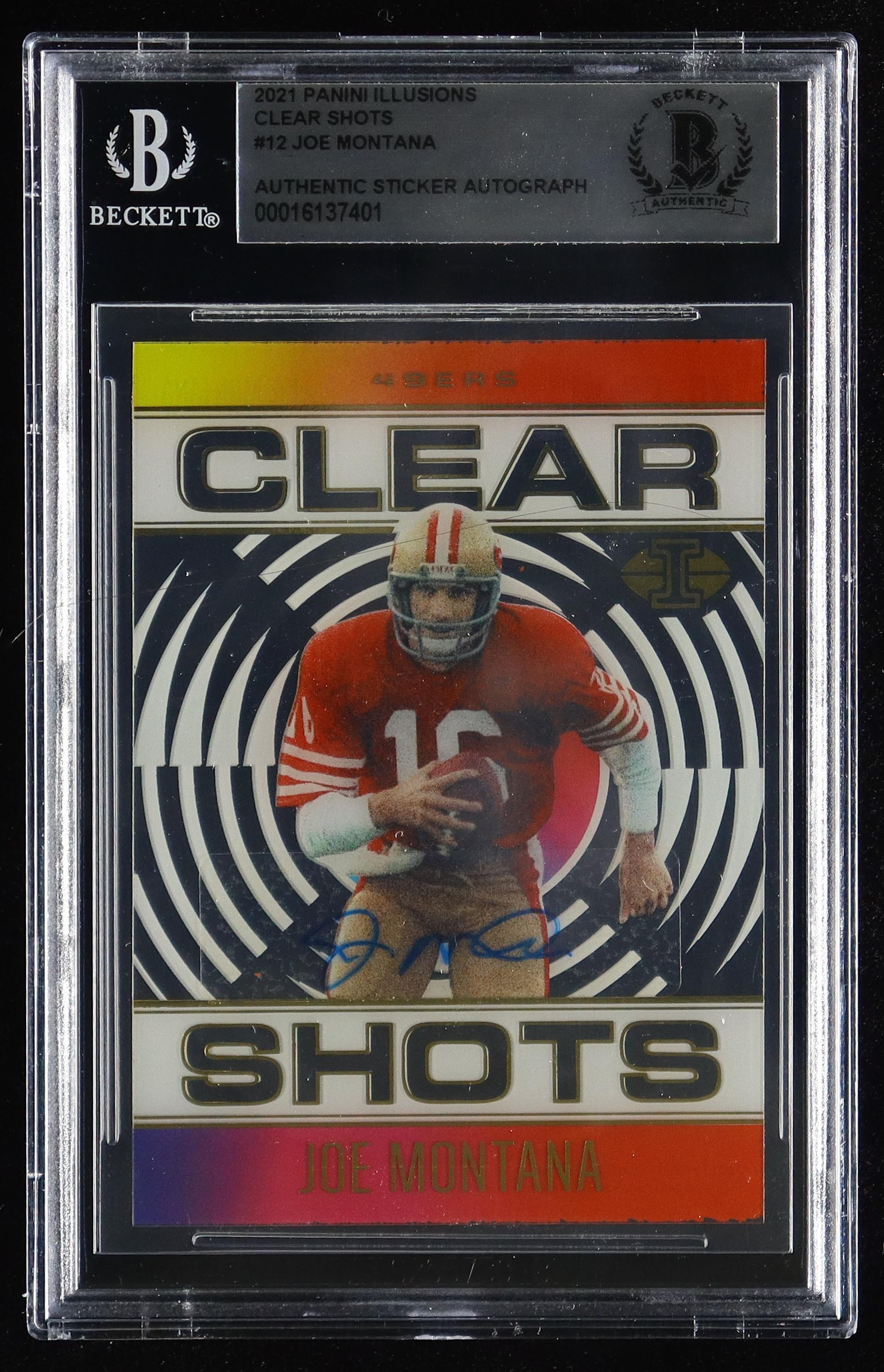 Joe Montana Signed Sticker On 2021 Panini Illusions Clear Shots #12 (BGS Encapsulated)