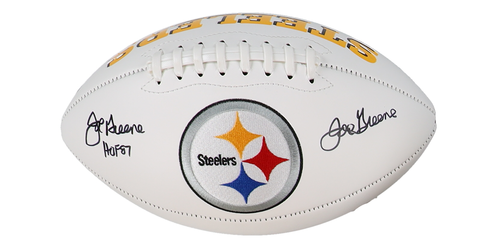 Pittsburgh Steelers logo football. Hand-signed and inscribed by Joe Greene (HOF). Please see images for details regarding the condition of the football.