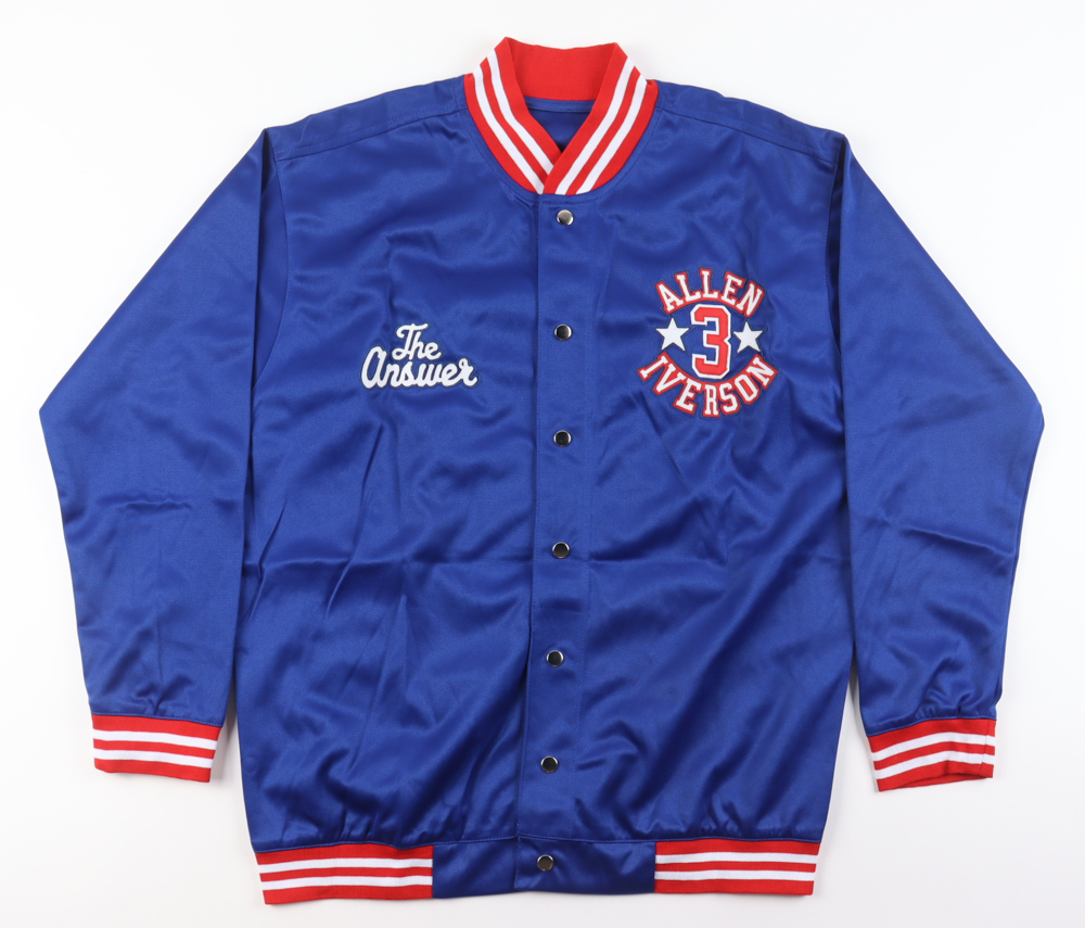 Custom jacket with everything sewn on, size XL. Has been hand-signed by Allen Iverson (HOF).