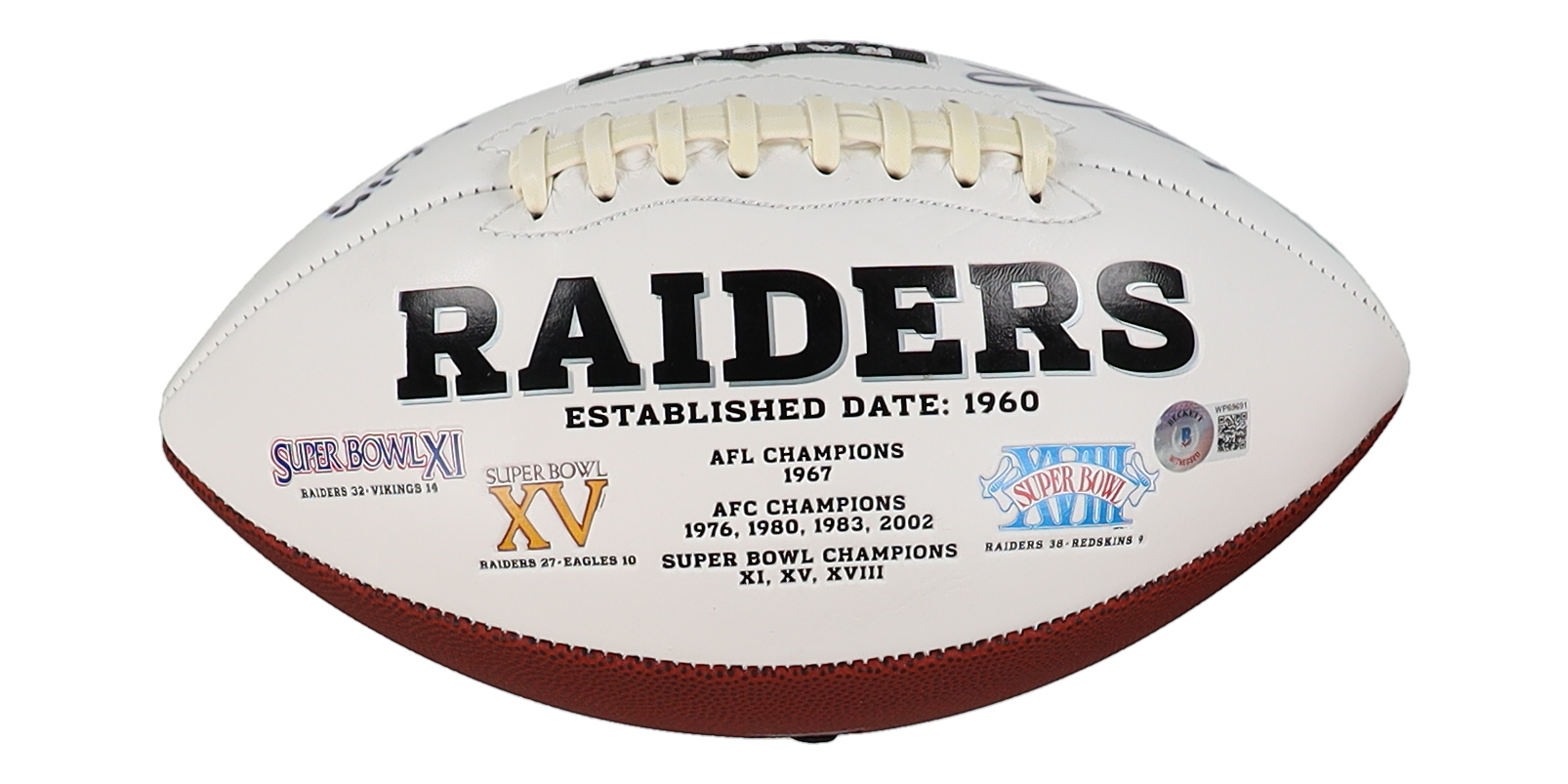 Oakland Raiders logo football has been hand-signed and inscribed by Shane Lechler. Please note, signature and inscription have bled.
