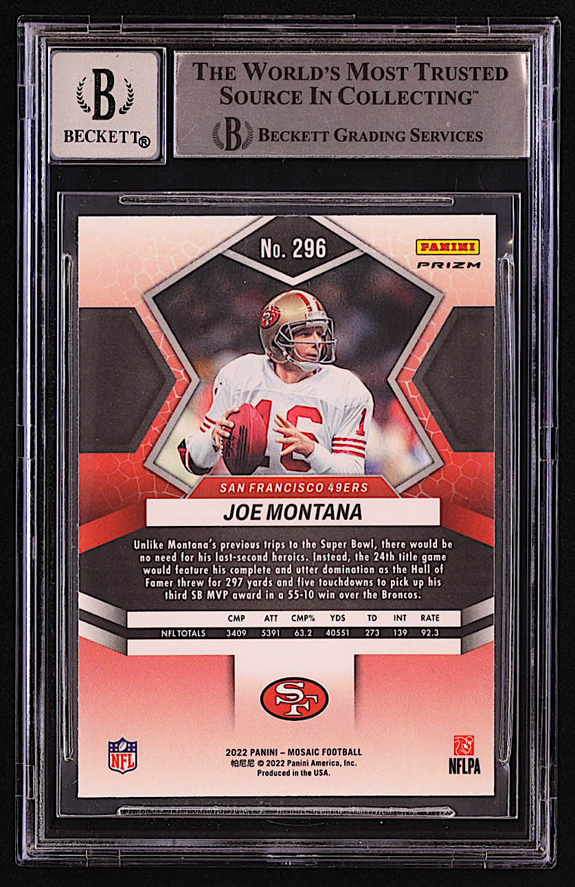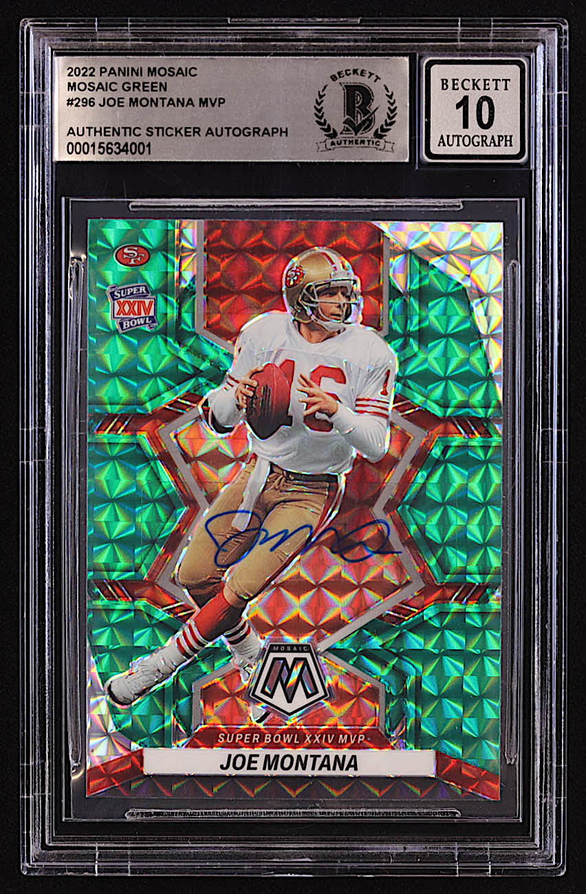 Joe Montana Signed Sticker On 2022 Panini Mosaic Mosaic Green #296 MVP (BGS | Auto 10)