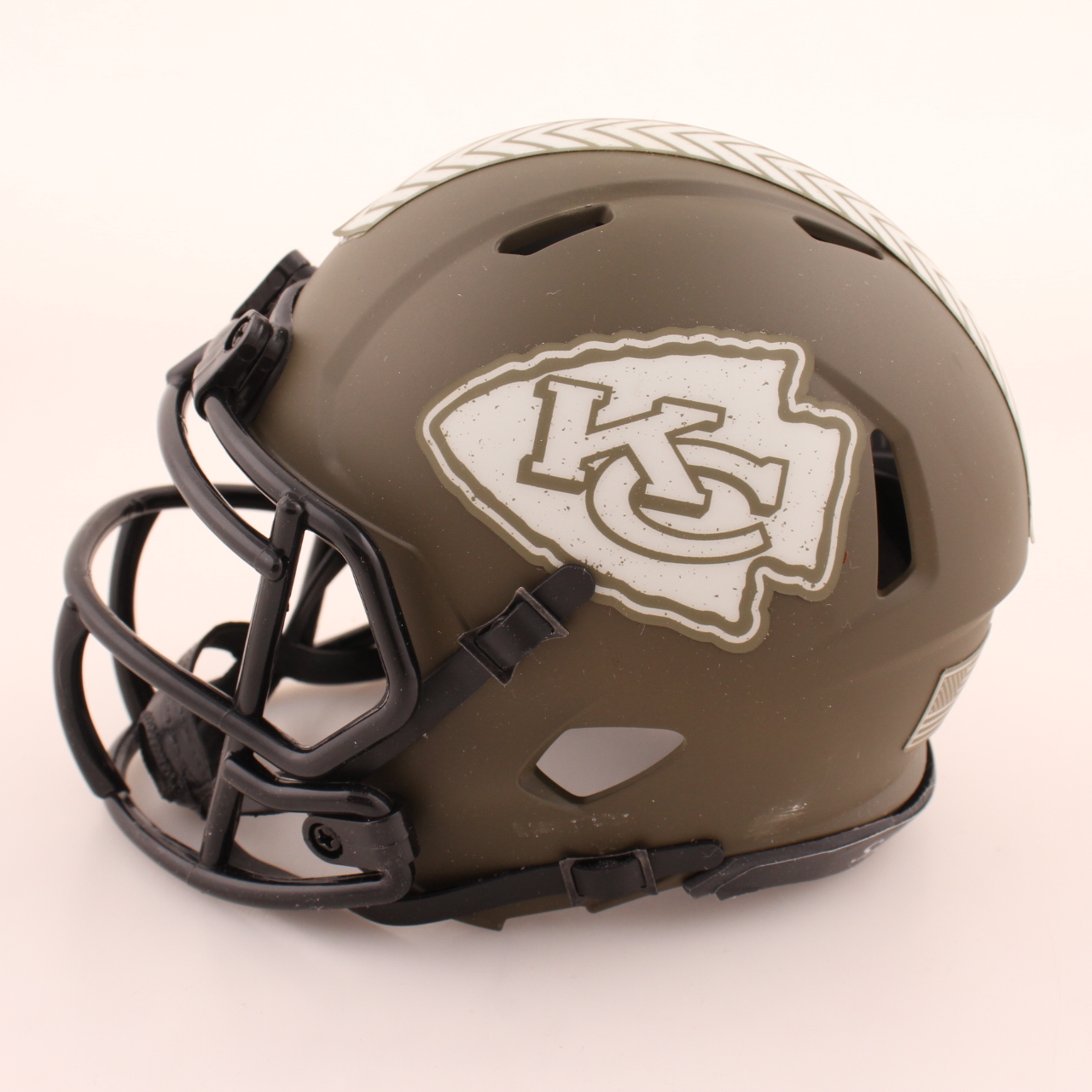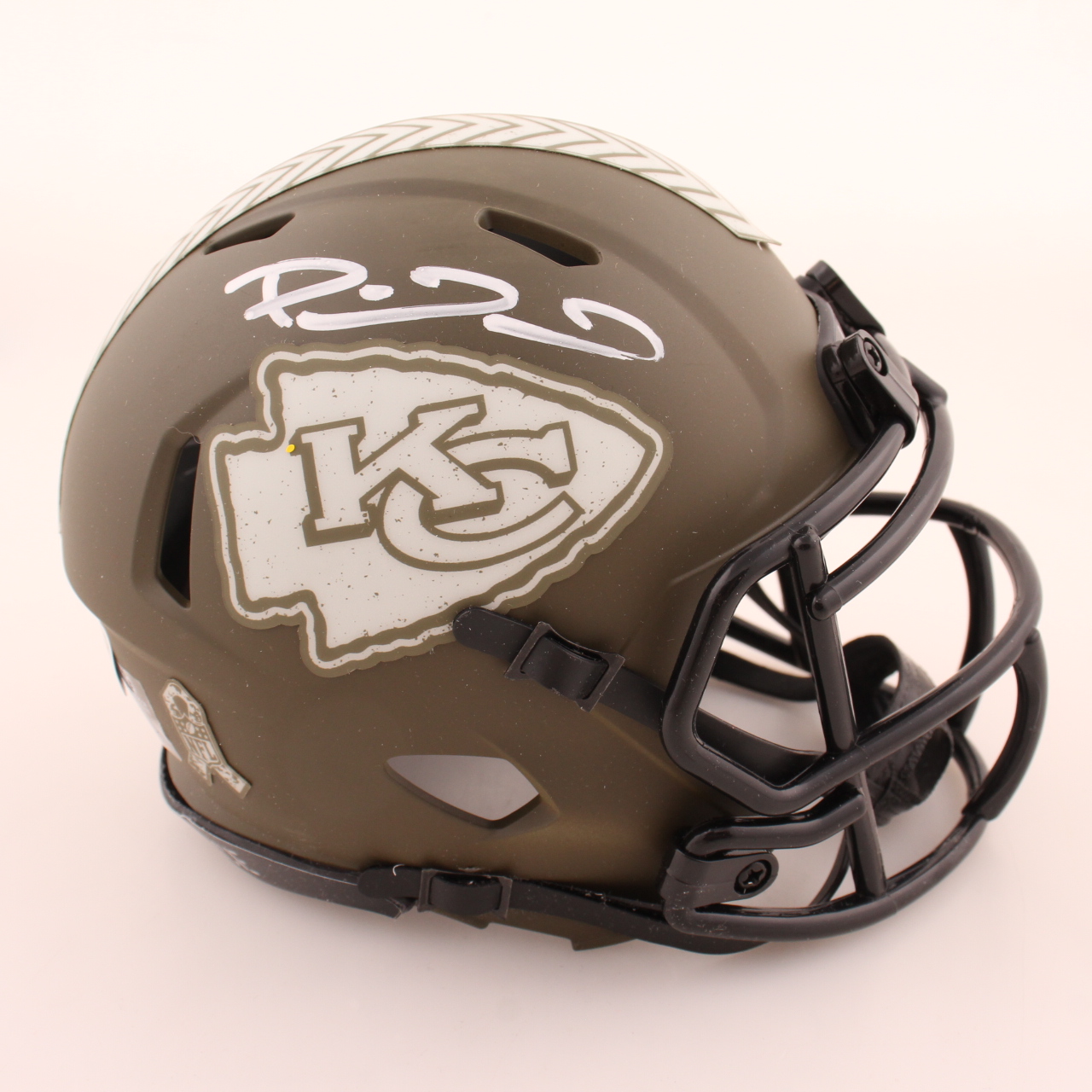 Riddell Kansas City Chiefs salute to service alternate speed mini helmet. Hand-signed by Patrick Mahomes.