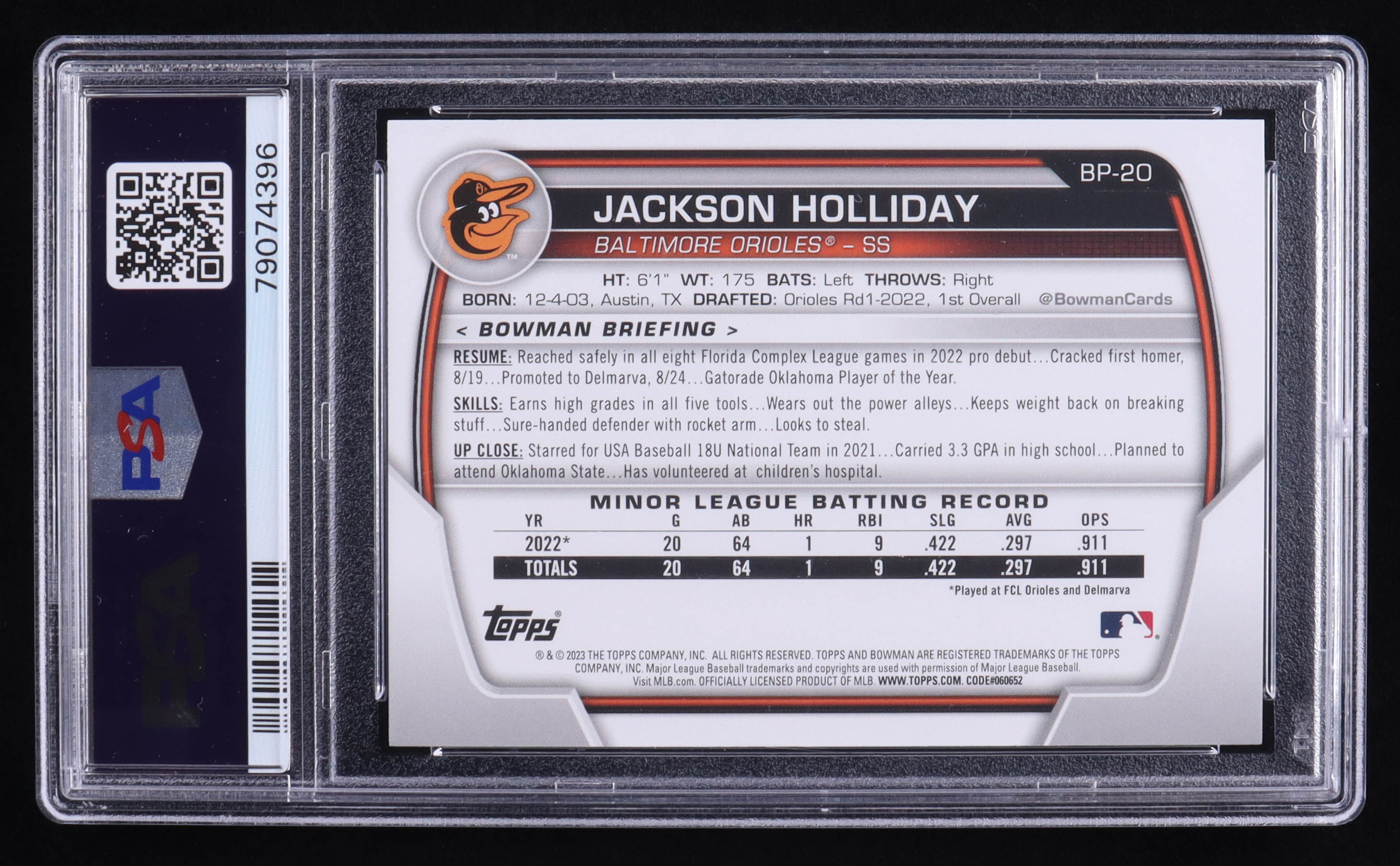 Jackson Holliday 2023 Bowman Prospects #BP20 RC (PSA 9)