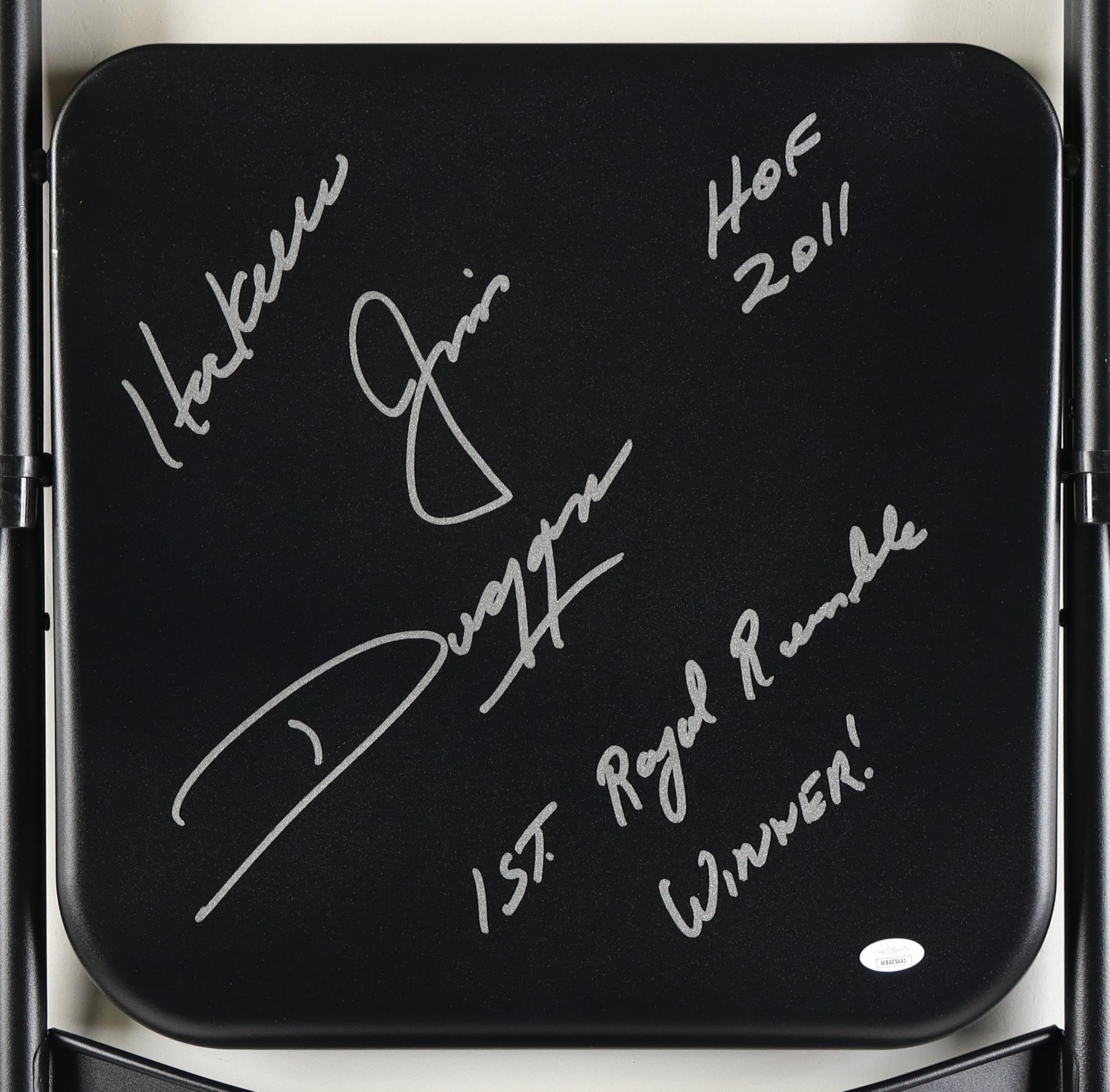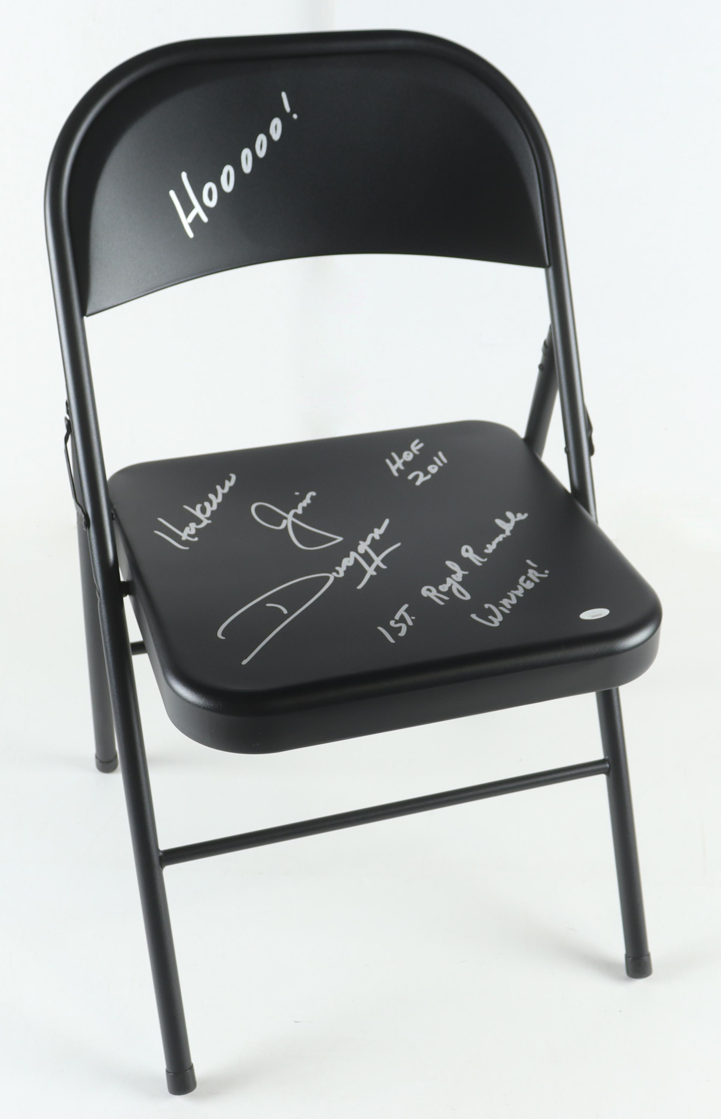 Hacksaw Jim Duggan Signed WWE Metal Folding Chair Inscribed "HOF 2011", "Hoooo!" & "1st Royal Rumble Winner!" (JSA)