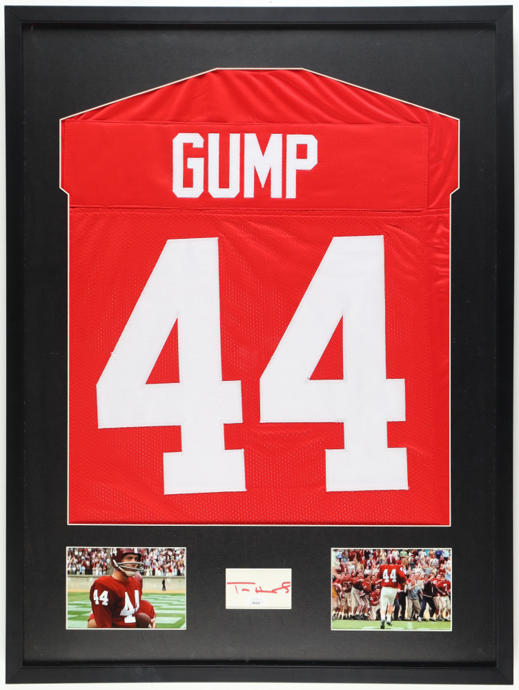 Custom frame measures approximately 23.5" x 31.5" in size and features a cut that has been hand signed by Tom Hanks. The display also includes an unsigned jersey.