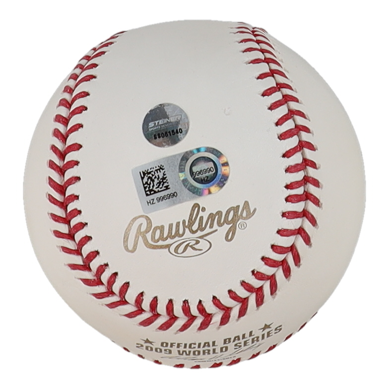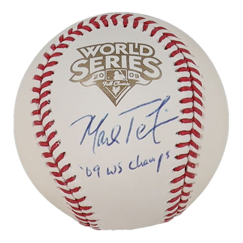 Rawlings Official 2009 World Series logo baseball. Hand-signed and inscribed by Mark Teixeira (New York Yankees). Please note, there are stains on the baseball.