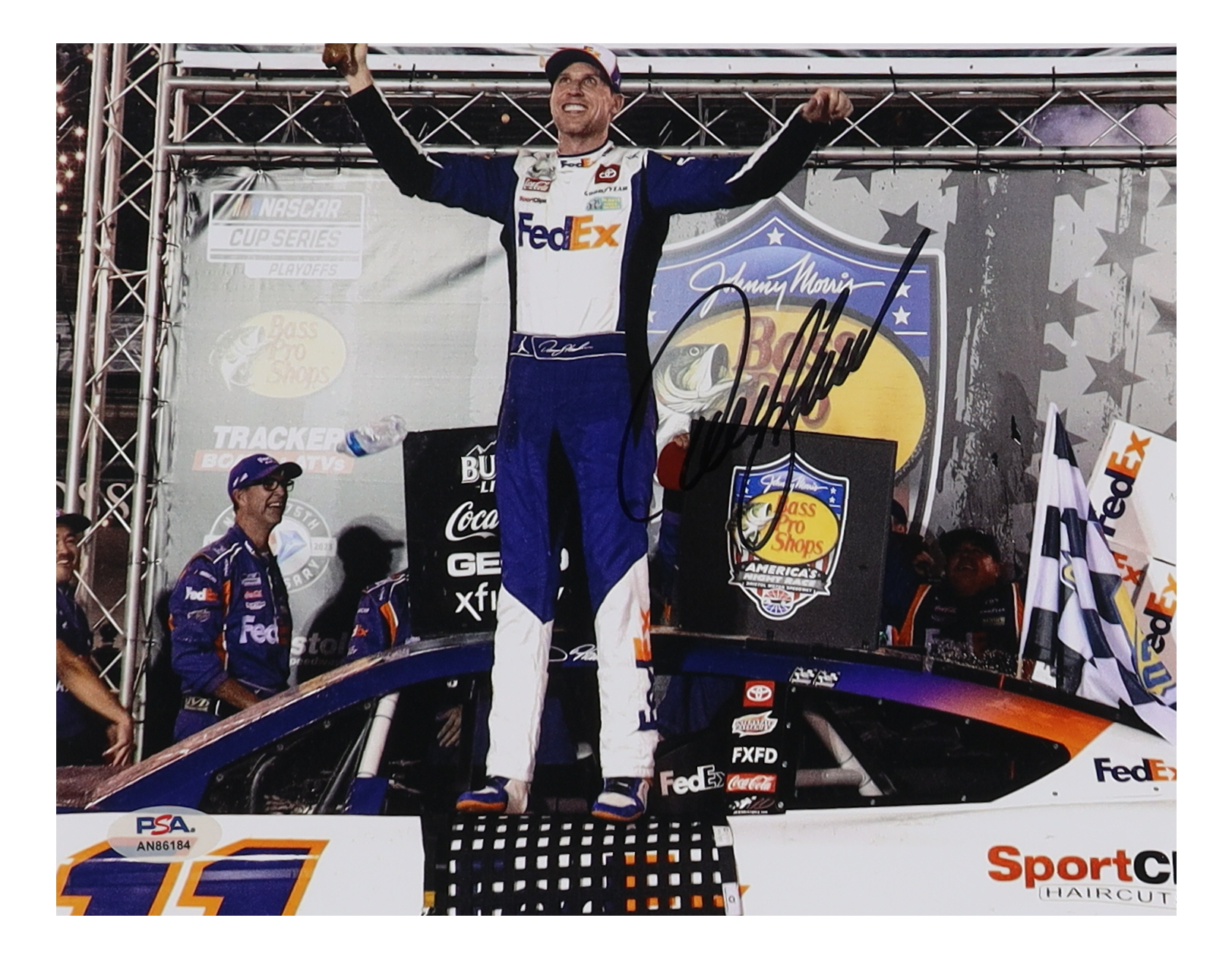 Photo measures 8" x 10" and has been hand-signed by Denny Hamlin.