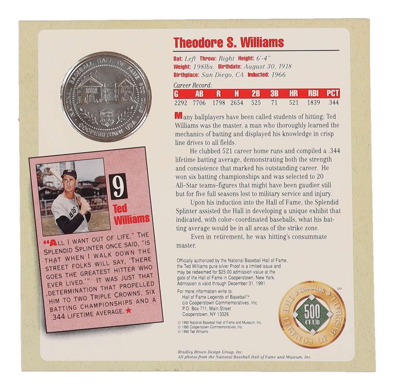Ted Williams Signed Red Sox Hall Of Fame Cooperstown Photo Card with Pure Silver Proof Coin (Williams)
