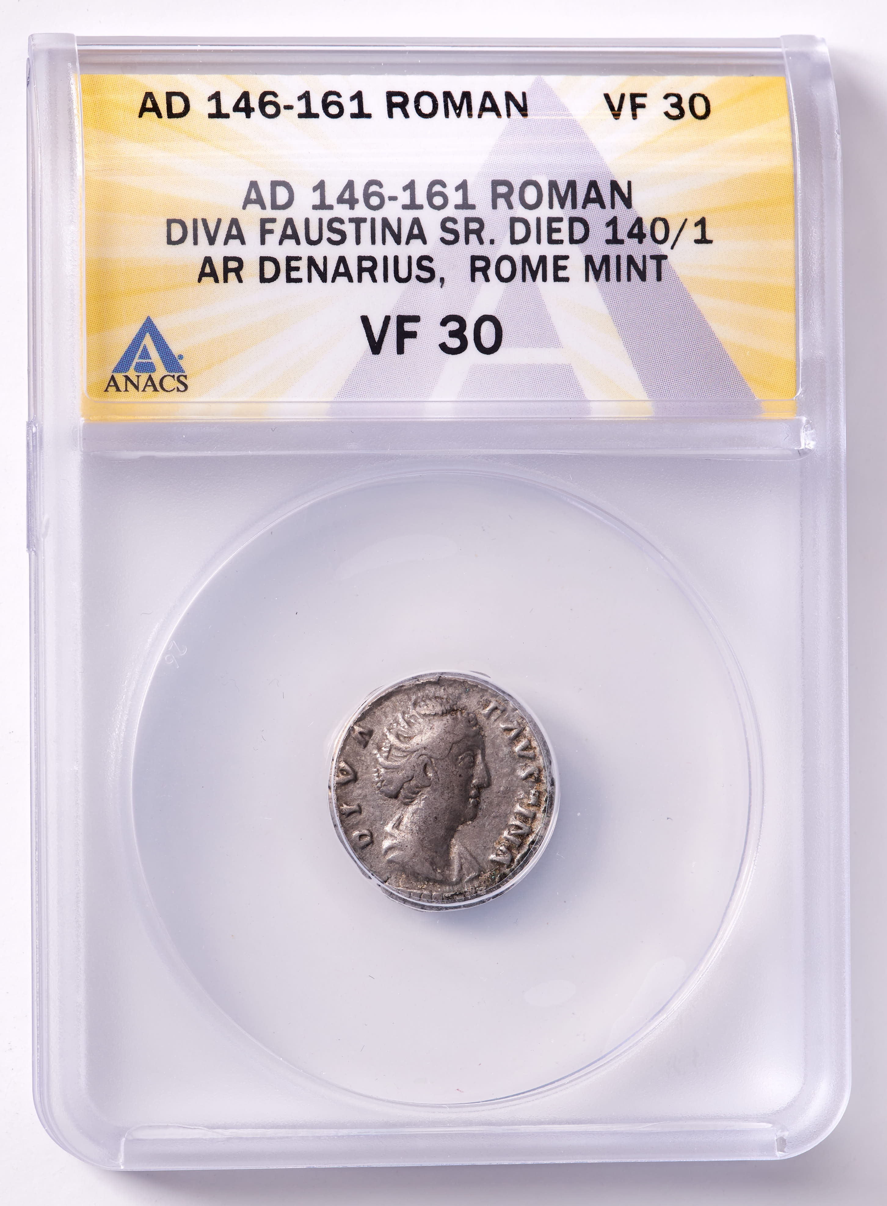 Diva Faustina Senior (A.D. 146-161) Roman Empire AR Denarius Ancient Silver Coin, Rome Mint (ANACS VF30)