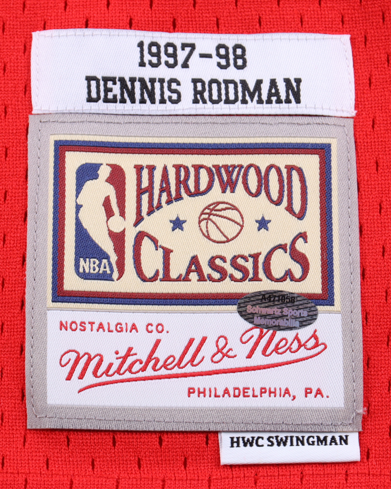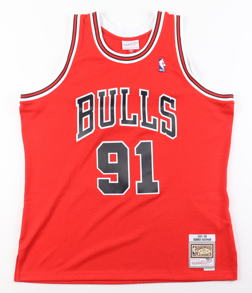 Mitchell & Ness jersey. Everything is pressed on, size XL. Hand-signed by Dennis Rodman (Chicago Bulls, HOF).